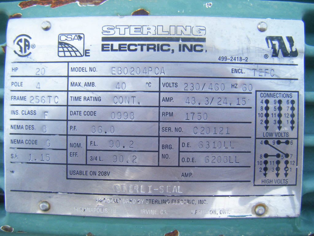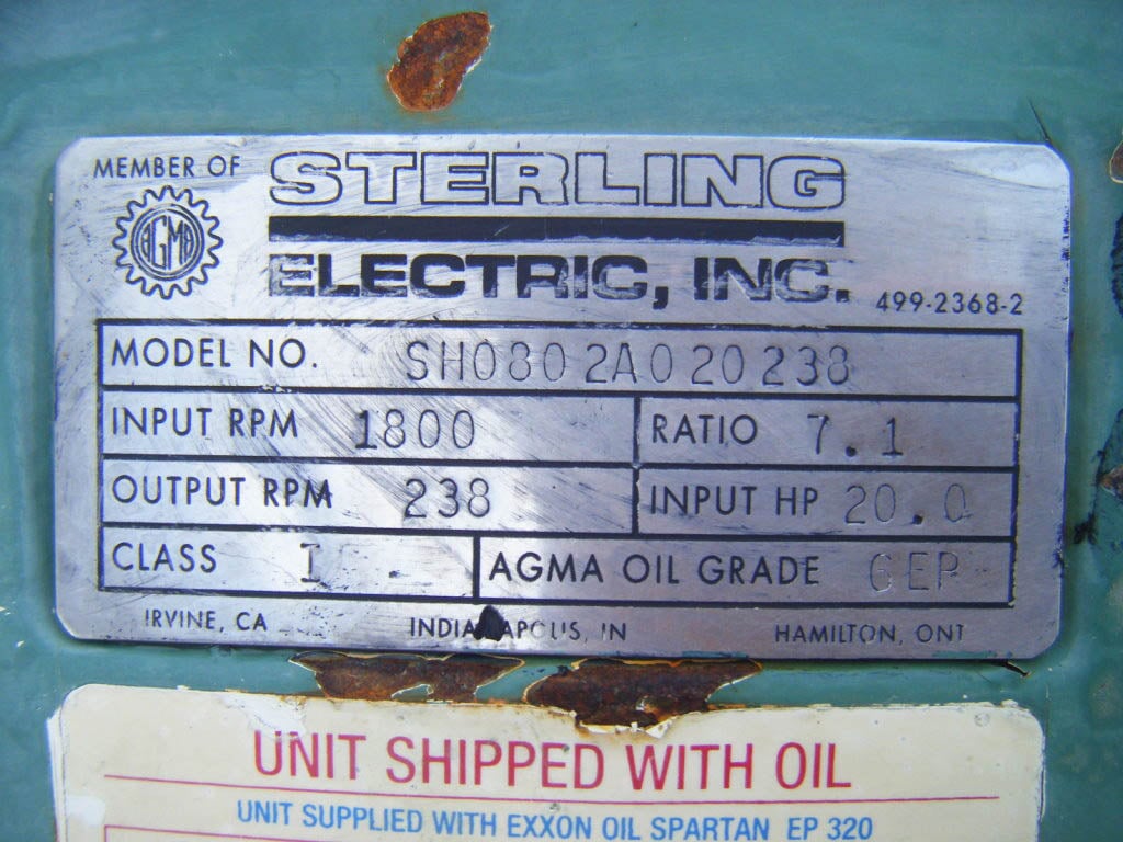 Tri-Clover Positive Displacement Pump. Model: PR300-4-N4-ST-N. Flow rate for new pump is 300 gpm with required horsepower and pressure. Discuss with salesperson your process and product to determine if this pump should handle your specific duty. Sterling Electric motor: 20 Hp, 1750 Rpm, 230/460 V, 48.3/24.15 A, 60 Hz, 3 Phase. Sterling Electric drive: 20.0 input Hp, 1800/238 Rpm in/out, 7.1 ratio. Overall dimensions: 5 ft. L x 1 ft. 4-1/4 in. W x 2 ft. H.(ACN181).