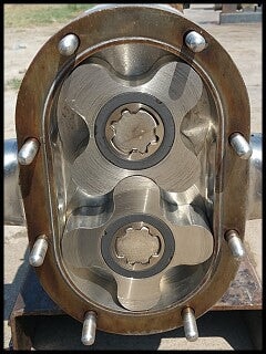 Tri Clover Rotary Lobe Positive Displacement Pump. Model: PR60. Pump maximum flowrate: 60 GPM at 20 PSI. Displacement per revolution: 0.175 gallons. US Electric Motor: 5 HP, 1745 RPM, 208/230/460V, 3-phase, 60 Hz, TE enclosure (also rated for 190/380V 50 Hz). Ports: 3 in. Tri-Clamp. Overall dimensions: 3 ft. 7 in. L x 1 ft. 4 in. W x 1 ft. 8 in. High.