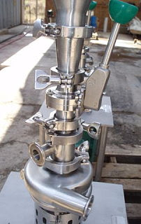 Tri Clover Tri-Blender. Model: F114MD-MBV-B60. S/N: 407604-01. Reliance Electric Motor, 3 hp, 3510 rpm, 230/460 V, 8.0/4.0 amps, 60 Hz, 3 phase. Inlets: (1) 8-3/4 in. dia. (hopper infeed). Outlets: (1) 1 in. dia. S-line fittings, (1) 1-1/2 in. dia. S-line fittings. Overall dimensions: 1 ft. 2 in. L x 1 ft. 2 in. W x 3 ft. 8-1/2 in. H.