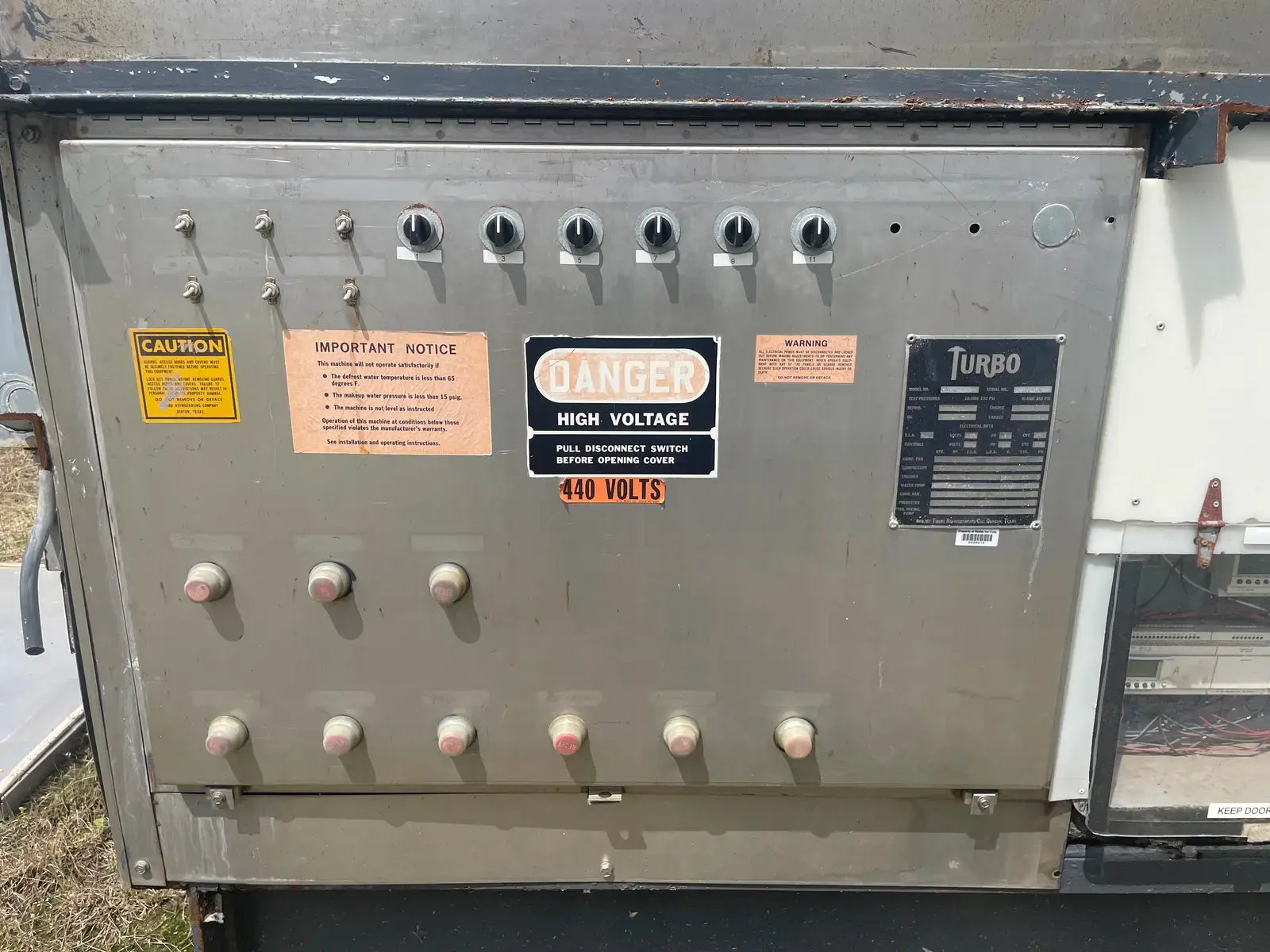 Turbo Plate Ice Maker. Model: CAR-144. Serial No: 8510400. Previous Refrigerant: Ammonia. Test Pressure - Lo Side: 150 PSI, Hi-Side: 350 PSI. Electrical Data - FLA: 41, Volts: 220, PH: 3, Hz: 60. Controls: Volts: 115, PH: 1, Hz: 60.