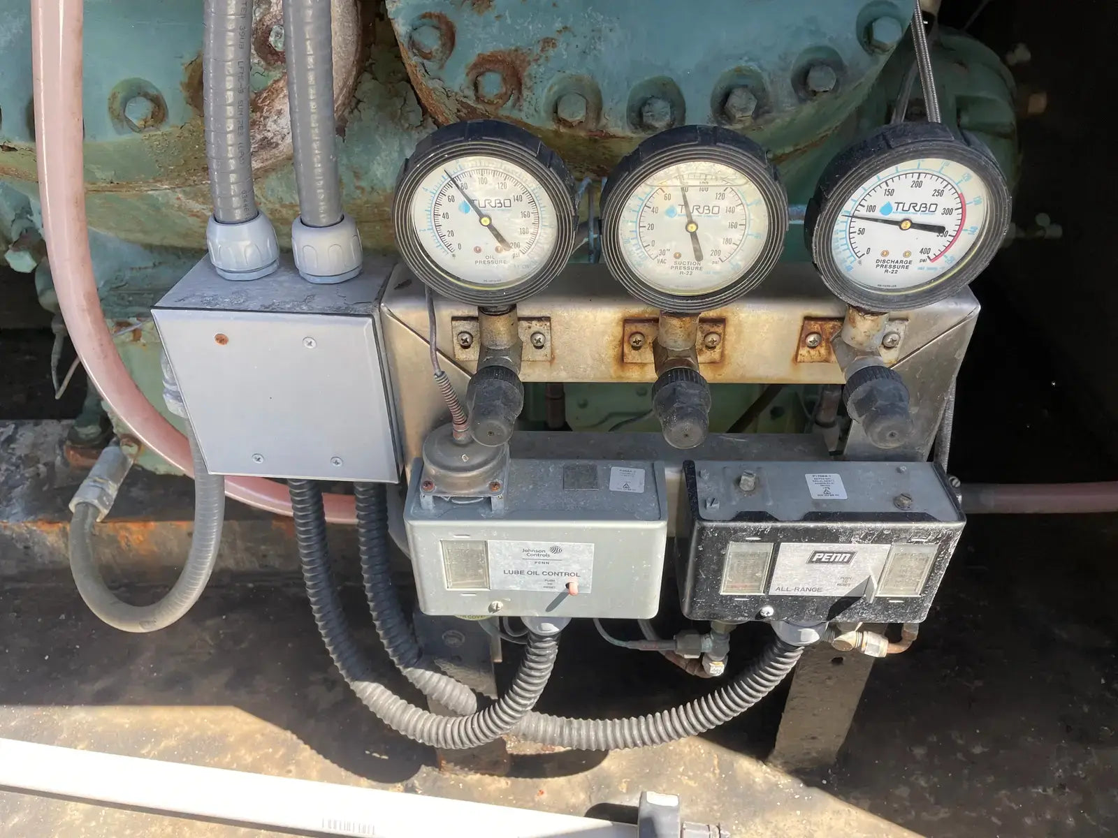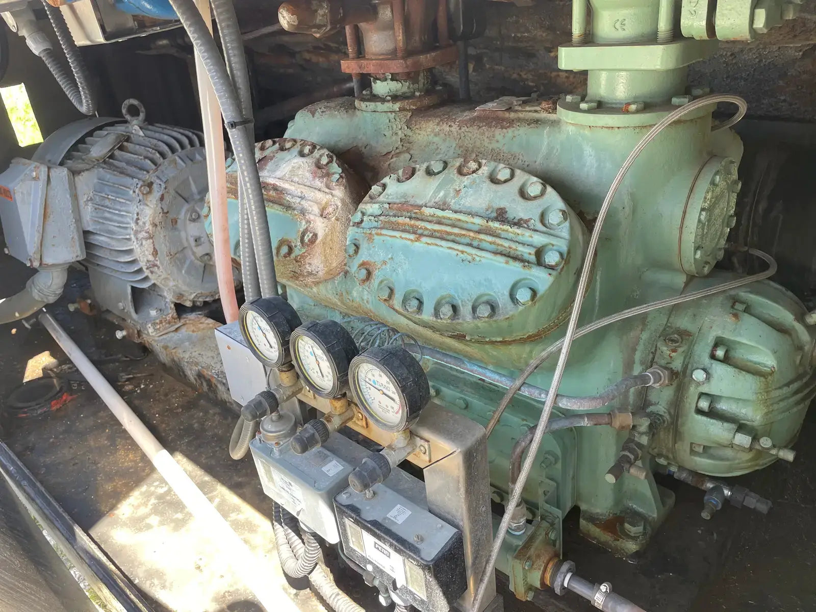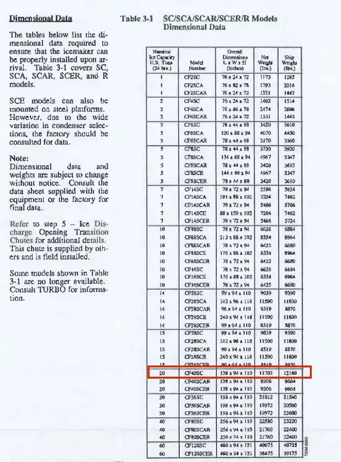 Vogt Ice Turbo C-Line Ice-Maker. Model: CF 40 SC. Nominal Ice Capacity Tons: 20 Tons in 24 hrs. Previous Refrigerant: R-22. Test Pressures: Lo-Side: 150 PSI, Hi-Side: 350 PSI. Semi-Hermetic Compressor - Oty: 1, HP: 75, Volts: 480, Hz: 60, Ph: 3, FLA: 96. Overall Dimensions: 129L x 100W x 110 H. Estimated Weight: 12,160 Lbs. On the removal procedure, Ice Maker was left charged with R-22.