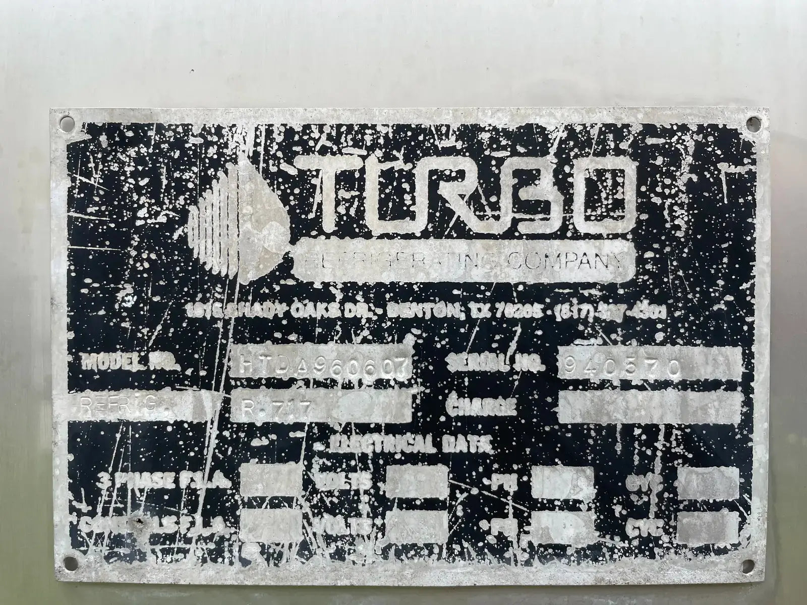 Turbo Ice Plate Chiller. Model No: HTDA960607. Serial No: 940570. Refrigeration: R-717. Number of Plates: 7. Plate Dimensions: 96 in x 60 in. Shipping Weight: 3581 LBS.