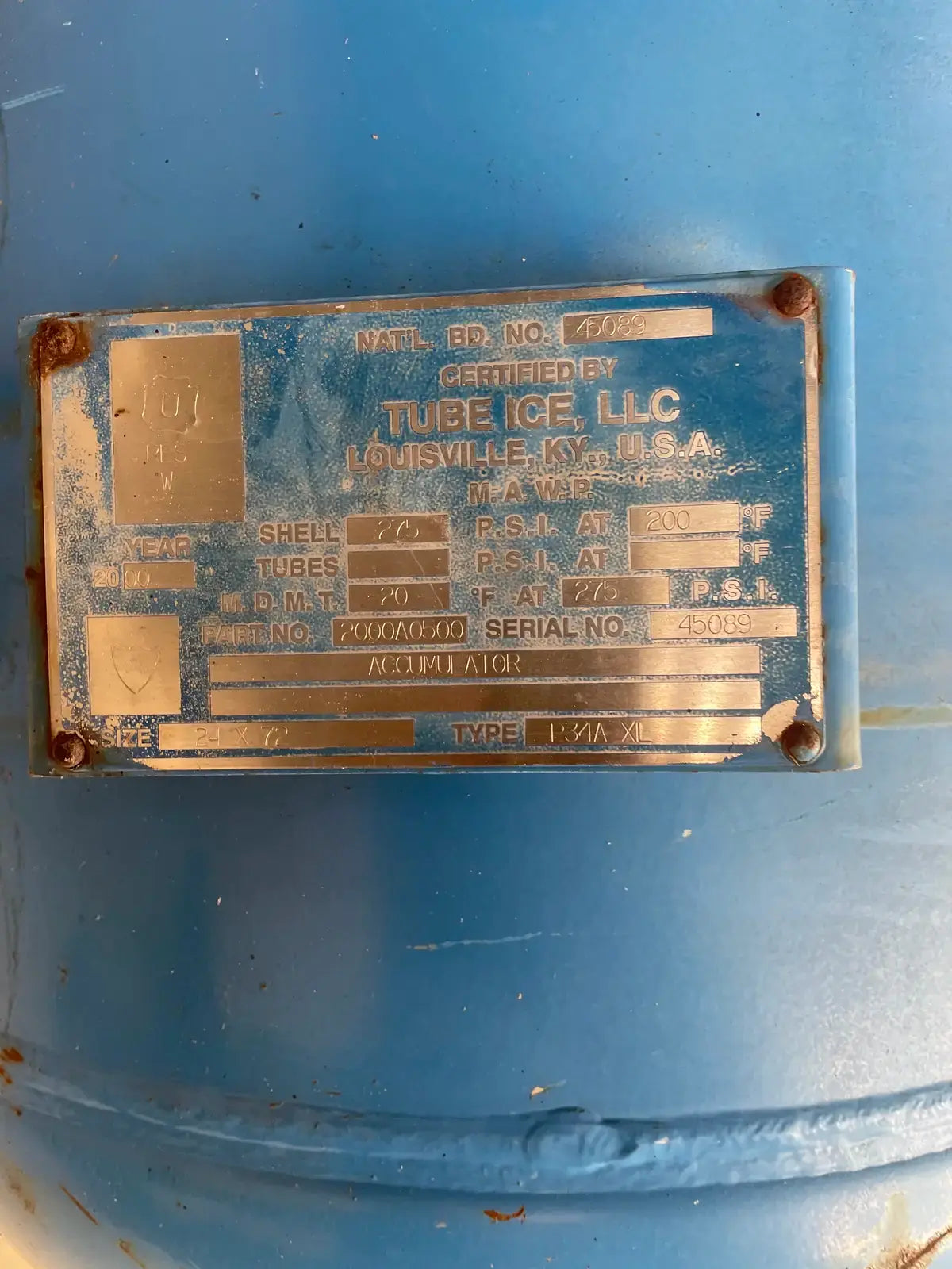 Certified Turbo Ice Accumulator. National Board: 45089. Serial No: 45089. Part No: 2000A0500. Size: 24x72. Type: P34AXL. Year Built: 2000. MDMT: -20 F @ 275 PSI. MAWP: 275 PSI @ 200 F. Estimated Gallon Capacity: 175 Gallons.