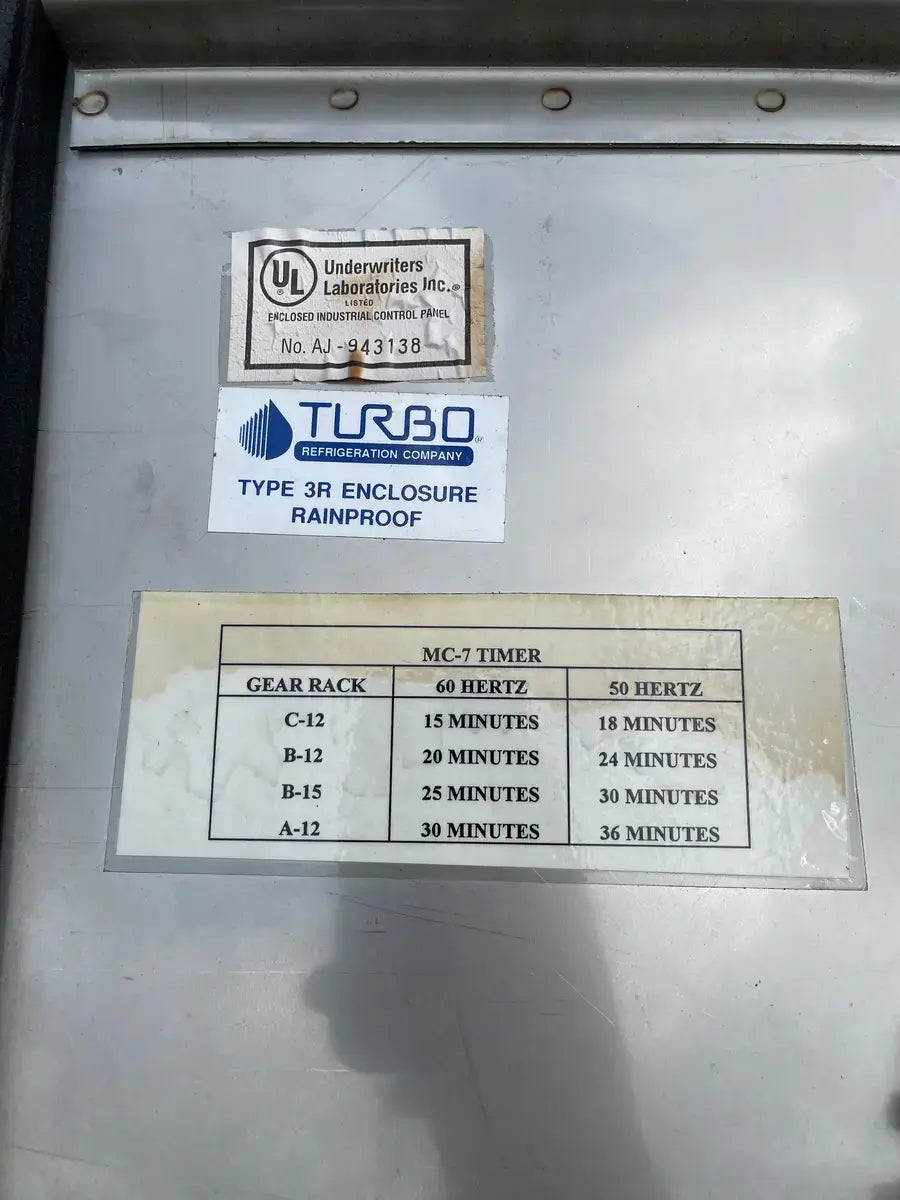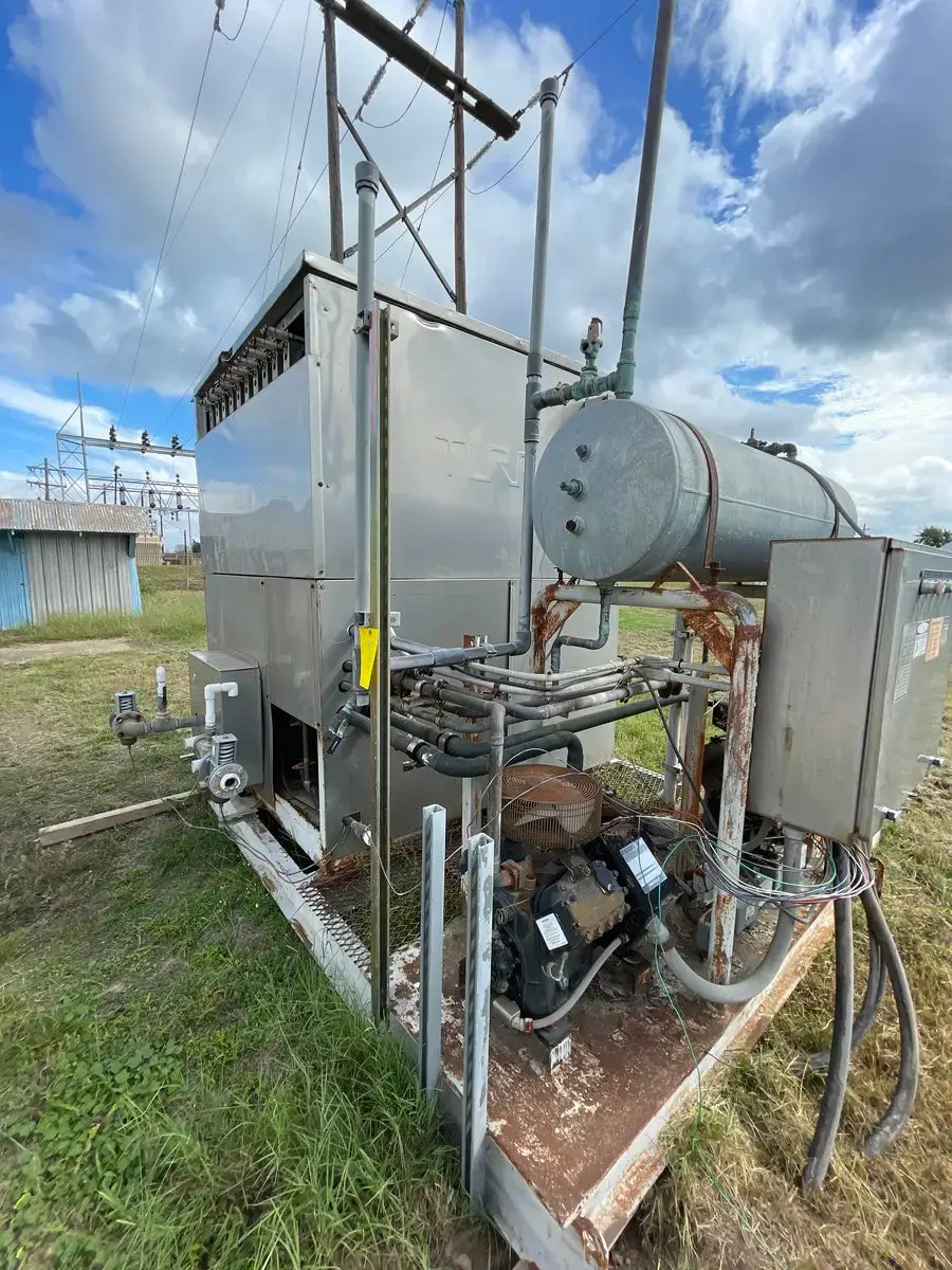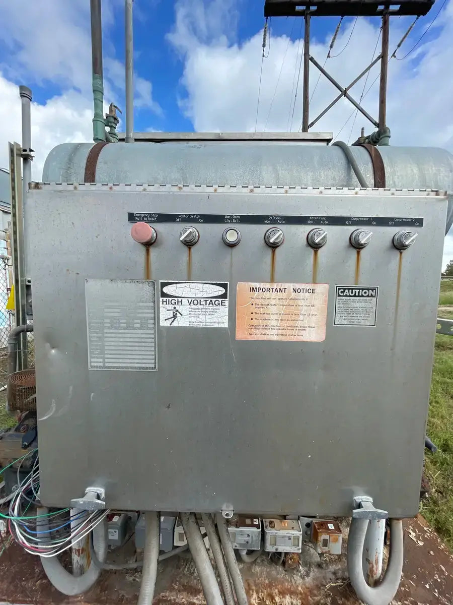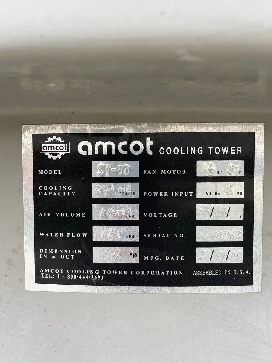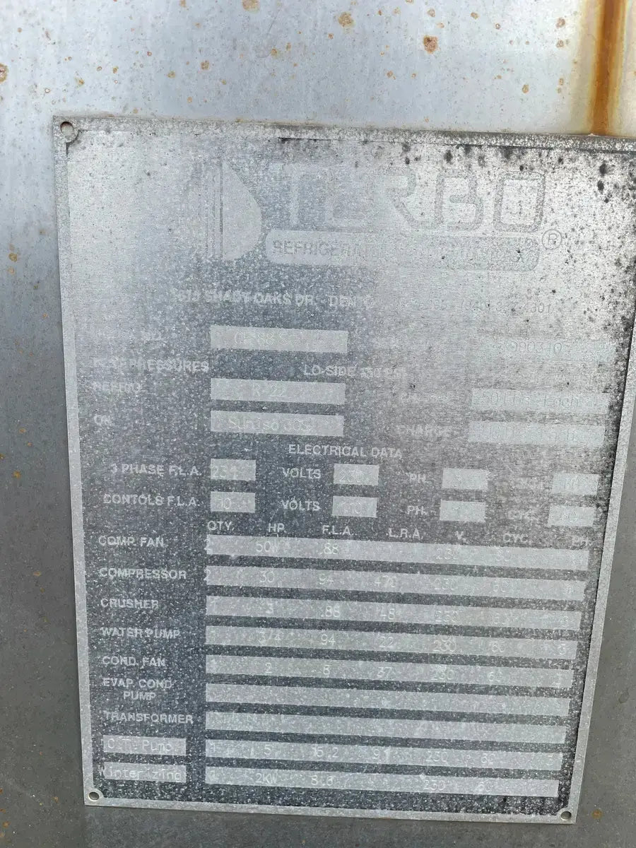 Turbo Refrigeration Ice Machine - Model No: CF 88 SC , Serial No: 990340. Pressures: Refrigerant: R-22, Charge: 50 LBS Each. OH: Electrical Data: 3 Phase FLA: 231, Volts: 230, PH: 3, Hz: 60. Controls FLA: 10, Volts: 110, PH: 1 Comp. Fan: Qty: 2, Hp: 50w, FLA: 88, Volt: 230, Cyc: 60, PH: 1 Compressor: Oty: 2 , Hp: 30, FLA: 94, LRA: 470, Volts: 230, Cyc: 60, Ph: 3 Crusher: Oty: 1, Hp: 3, FLA: .88, LRA: 48, Volts: 250, Cyc: 60, Ph: 3 Water Pump: Qty: 1: Hp: 3/4, FLA: 94, LRA: 22, Volts: 230, Cyc: 60, Ph: 3 Cond. Fan: Qty: 1, Hp: 2, FLA: 8, LRA: 37, Volts: 230, Cyc: 60, Ph: 3 C.T Pump: Oty: 1, Hp: 5, FLA: 5.2. LRA: 9, Volts: 230, Cyc: 60, Ph: 3 Winterizing: Oty: 1, HP: 2 KW, FLA: 8.6, Volts: 230, Cyc: 60, Ph: 3 Amcot Cooling Tower - Model: ST-70, Cooling Capacity: 840,000 BTU/HR , Air Volume: 17500 CFM, Water Flow: 145 GPM, Fan Motor: 1 1/2 Hp, Power Input: 60 Hz 3 PH, Voltage: 220/440, Serial No: 100368, MFG Date: 8/17/2015. Fan Diameter: 46, Torque Rating: 11. Motor Hp: 1 1/2, Ph: 3, Voltage: 208-230/460, RPM: 830, Poles: 8, Frame Size: 182T, Amp Draw: 5.3-5.8/2.9, Type: TENV. 20 Gallon Chil-Con R-22 Receiver - MAWP: 400 PSI @ 400 F, MDMT: -20 F @ 400 PSI, Serial C900082A-1, C.I.N: 5.911.174, MFG Date: 1990, CRN: H8890.5123467890TY, Model: RE-14036-800.
