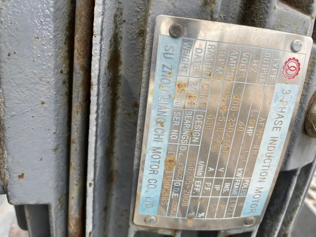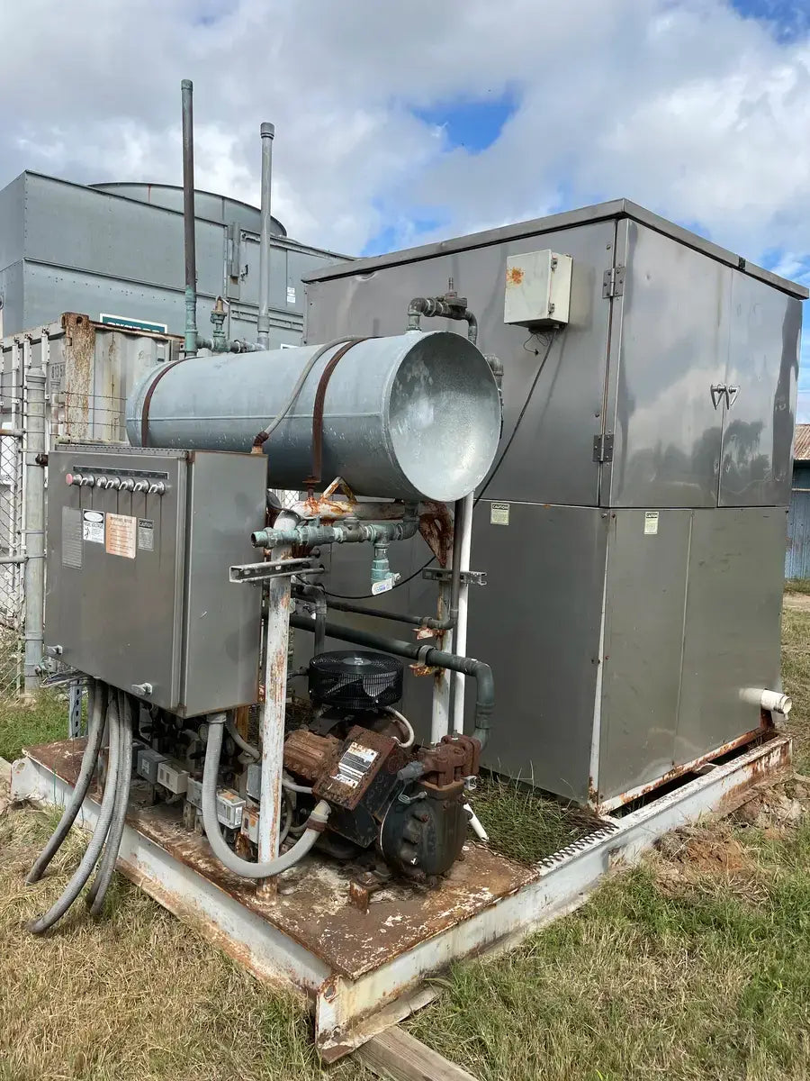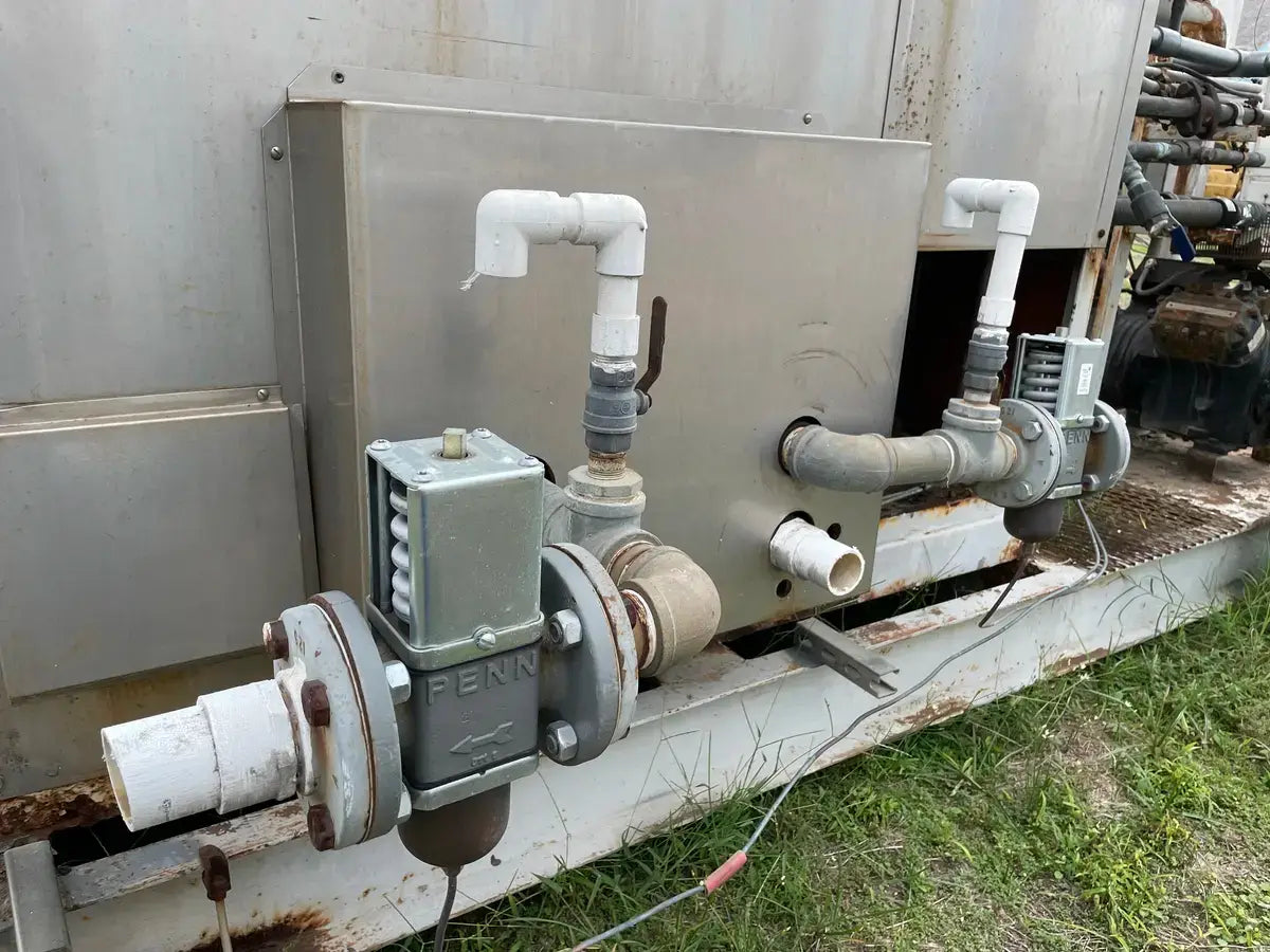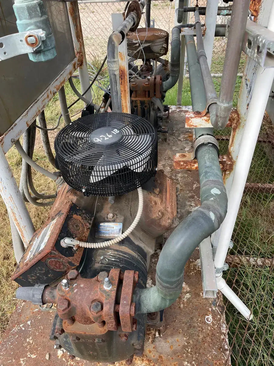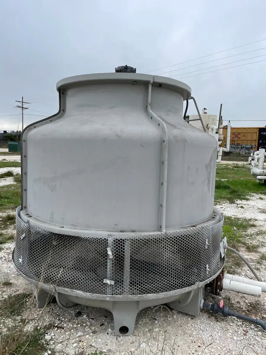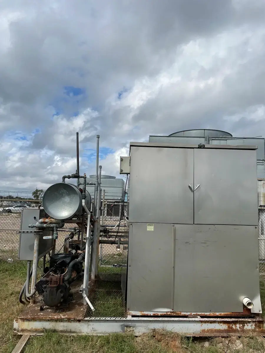 Turbo Refrigeration Ice Machine - Model No: CF 88 SC , Serial No: 990340. Pressures: Refrigerant: R-22, Charge: 50 LBS Each. OH: Electrical Data: 3 Phase FLA: 231, Volts: 230, PH: 3, Hz: 60. Controls FLA: 10, Volts: 110, PH: 1 Comp. Fan: Qty: 2, Hp: 50w, FLA: 88, Volt: 230, Cyc: 60, PH: 1 Compressor: Oty: 2 , Hp: 30, FLA: 94, LRA: 470, Volts: 230, Cyc: 60, Ph: 3 Crusher: Oty: 1, Hp: 3, FLA: .88, LRA: 48, Volts: 250, Cyc: 60, Ph: 3 Water Pump: Qty: 1: Hp: 3/4, FLA: 94, LRA: 22, Volts: 230, Cyc: 60, Ph: 3 Cond. Fan: Qty: 1, Hp: 2, FLA: 8, LRA: 37, Volts: 230, Cyc: 60, Ph: 3 C.T Pump: Oty: 1, Hp: 5, FLA: 5.2. LRA: 9, Volts: 230, Cyc: 60, Ph: 3 Winterizing: Oty: 1, HP: 2 KW, FLA: 8.6, Volts: 230, Cyc: 60, Ph: 3 Amcot Cooling Tower - Model: ST-70, Cooling Capacity: 840,000 BTU/HR , Air Volume: 17500 CFM, Water Flow: 145 GPM, Fan Motor: 1 1/2 Hp, Power Input: 60 Hz 3 PH, Voltage: 220/440, Serial No: 100368, MFG Date: 8/17/2015. Fan Diameter: 46, Torque Rating: 11. Motor Hp: 1 1/2, Ph: 3, Voltage: 208-230/460, RPM: 830, Poles: 8, Frame Size: 182T, Amp Draw: 5.3-5.8/2.9, Type: TENV. 20 Gallon Chil-Con R-22 Receiver - MAWP: 400 PSI @ 400 F, MDMT: -20 F @ 400 PSI, Serial C900082A-1, C.I.N: 5.911.174, MFG Date: 1990, CRN: H8890.5123467890TY, Model: RE-14036-800.