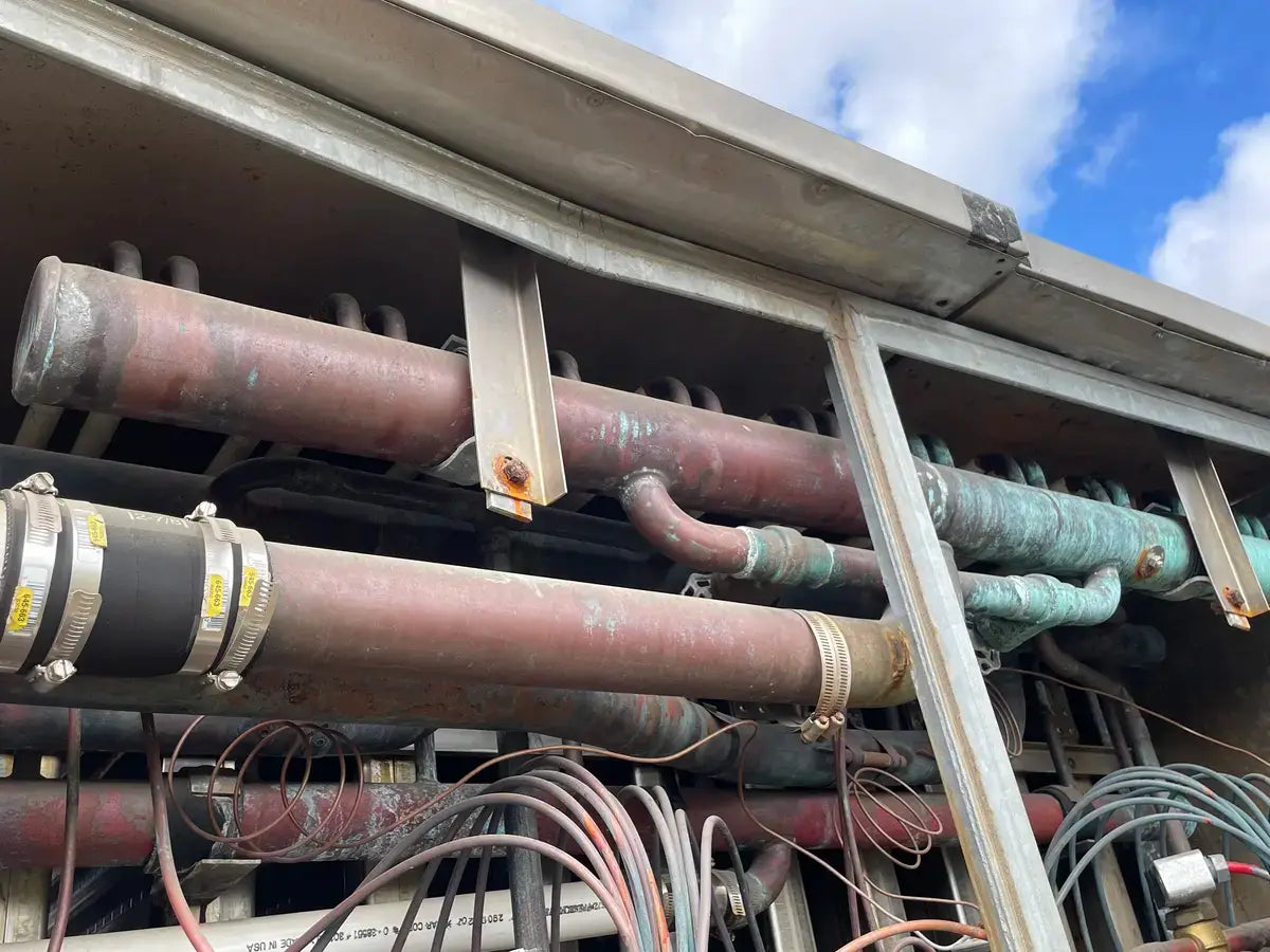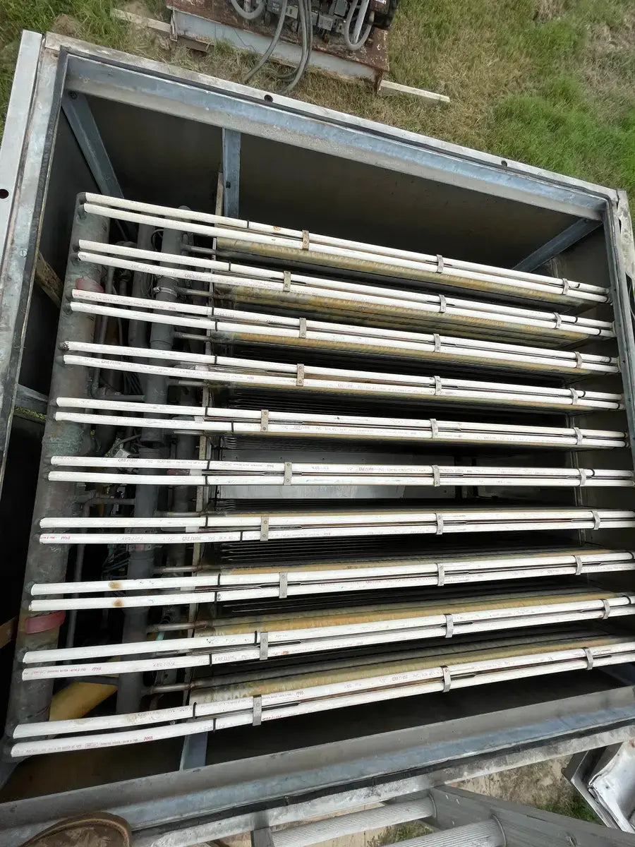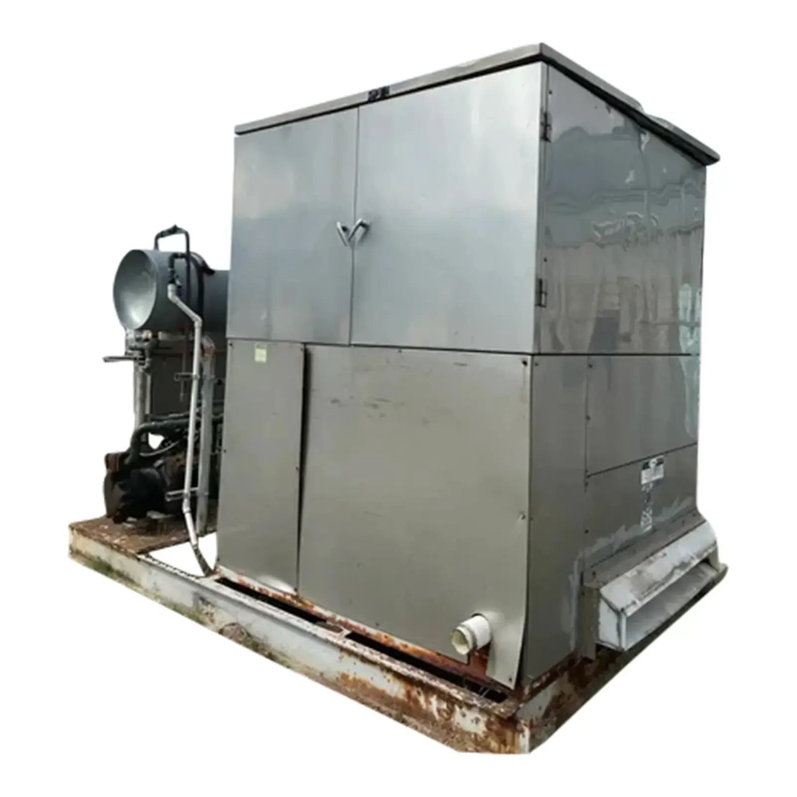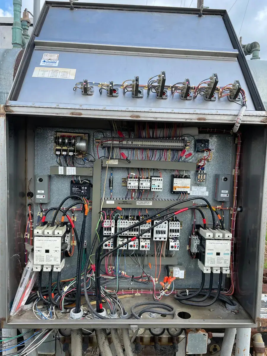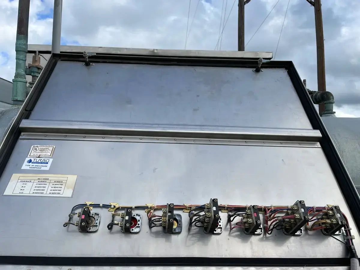 Turbo Refrigeration Ice Machine - Model No: CF 88 SC , Serial No: 990340. Pressures: Refrigerant: R-22, Charge: 50 LBS Each. OH: Electrical Data: 3 Phase FLA: 231, Volts: 230, PH: 3, Hz: 60. Controls FLA: 10, Volts: 110, PH: 1 Comp. Fan: Qty: 2, Hp: 50w, FLA: 88, Volt: 230, Cyc: 60, PH: 1 Compressor: Oty: 2 , Hp: 30, FLA: 94, LRA: 470, Volts: 230, Cyc: 60, Ph: 3 Crusher: Oty: 1, Hp: 3, FLA: .88, LRA: 48, Volts: 250, Cyc: 60, Ph: 3 Water Pump: Qty: 1: Hp: 3/4, FLA: 94, LRA: 22, Volts: 230, Cyc: 60, Ph: 3 Cond. Fan: Qty: 1, Hp: 2, FLA: 8, LRA: 37, Volts: 230, Cyc: 60, Ph: 3 C.T Pump: Oty: 1, Hp: 5, FLA: 5.2. LRA: 9, Volts: 230, Cyc: 60, Ph: 3 Winterizing: Oty: 1, HP: 2 KW, FLA: 8.6, Volts: 230, Cyc: 60, Ph: 3 Amcot Cooling Tower - Model: ST-70, Cooling Capacity: 840,000 BTU/HR , Air Volume: 17500 CFM, Water Flow: 145 GPM, Fan Motor: 1 1/2 Hp, Power Input: 60 Hz 3 PH, Voltage: 220/440, Serial No: 100368, MFG Date: 8/17/2015. Fan Diameter: 46, Torque Rating: 11. Motor Hp: 1 1/2, Ph: 3, Voltage: 208-230/460, RPM: 830, Poles: 8, Frame Size: 182T, Amp Draw: 5.3-5.8/2.9, Type: TENV. 20 Gallon Chil-Con R-22 Receiver - MAWP: 400 PSI @ 400 F, MDMT: -20 F @ 400 PSI, Serial C900082A-1, C.I.N: 5.911.174, MFG Date: 1990, CRN: H8890.5123467890TY, Model: RE-14036-800.