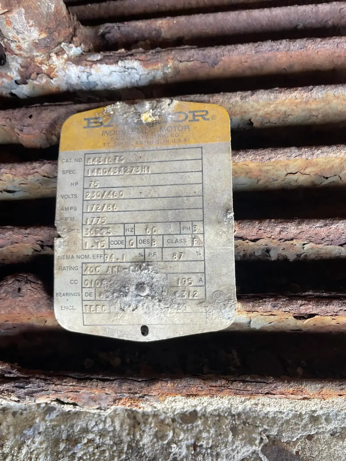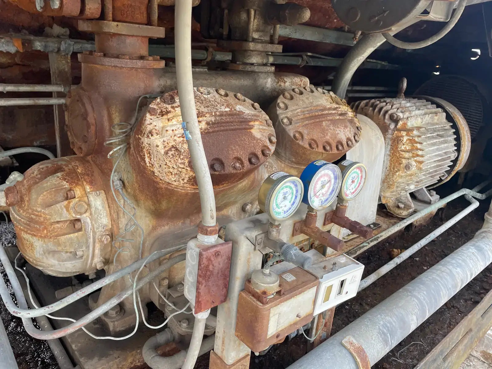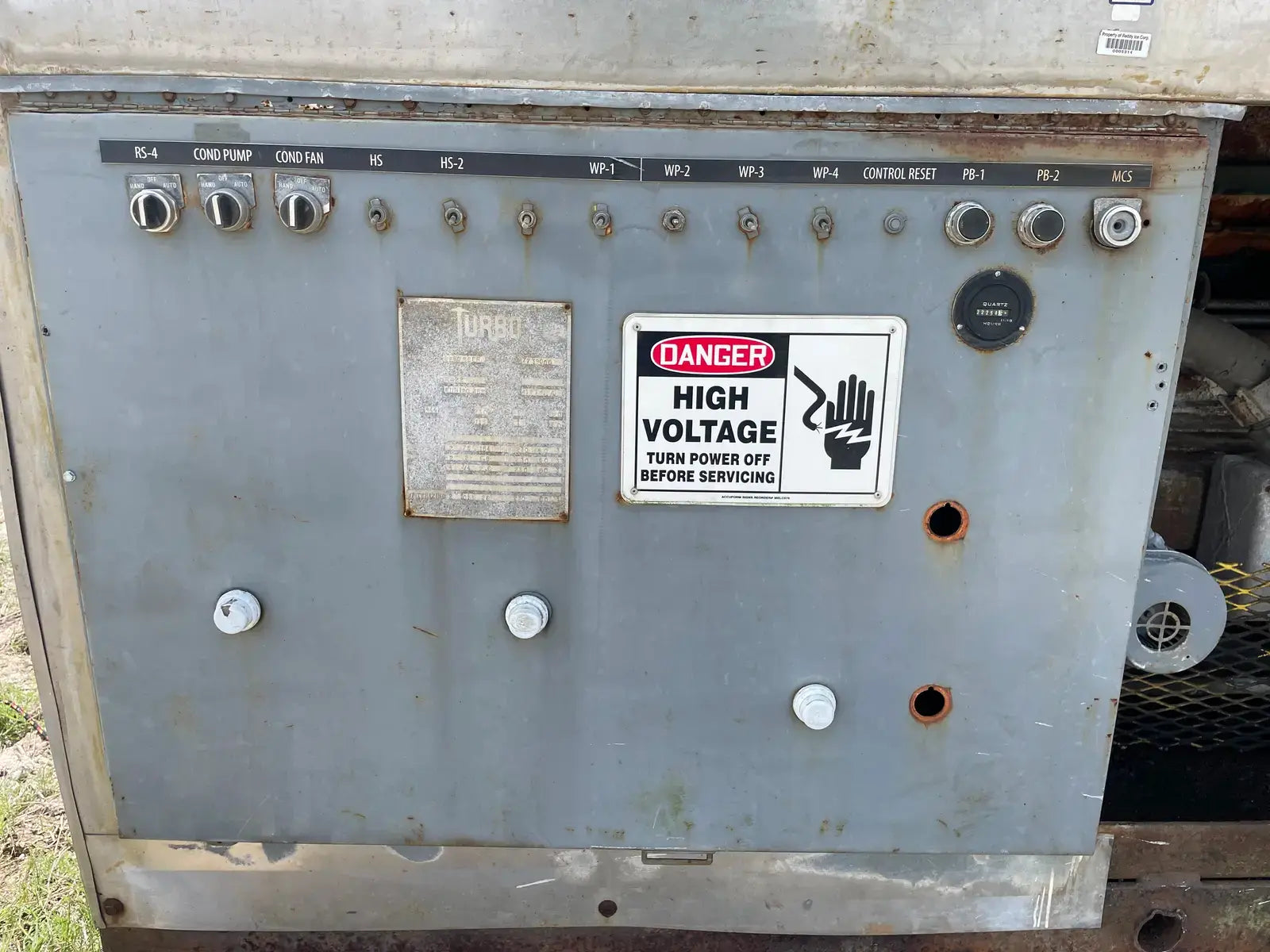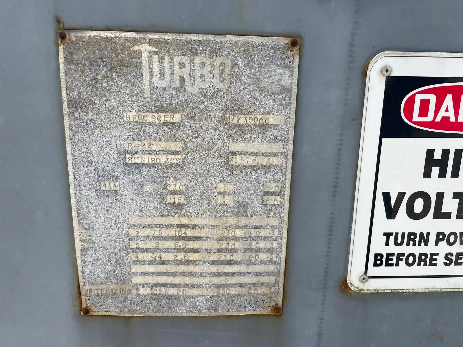 Turbo Vogt Ice Maker. Model: BF80 SCER. Serial No: 7739000. Refrigerant: R-22. Self-Contained evaporative remote. Ton Per Day: 80. Power supply for compressors(2): 75 HP, FLA: 184, Volts: 230, Hz: 3, Ph: 3. Crusher(2): 2 HP, FLA: 6.8, Volts: 230, Hz: 60. Water Pump(4): 3/4 HP, FLA: 2.6 Volts: 230, Hz: 60.