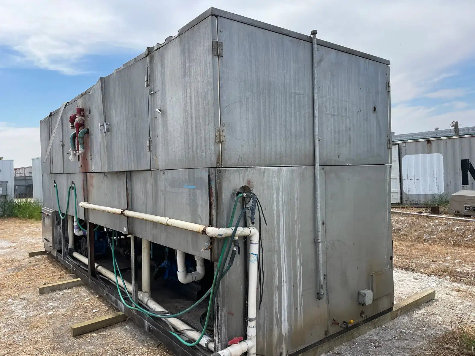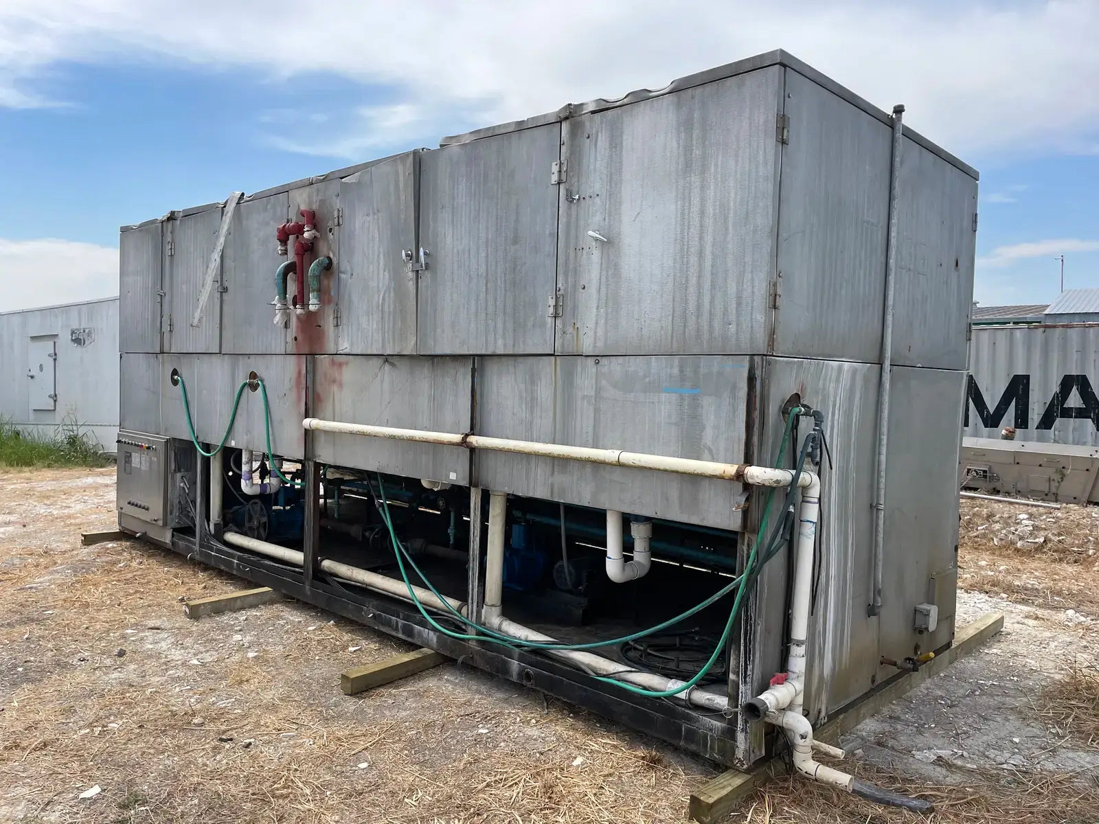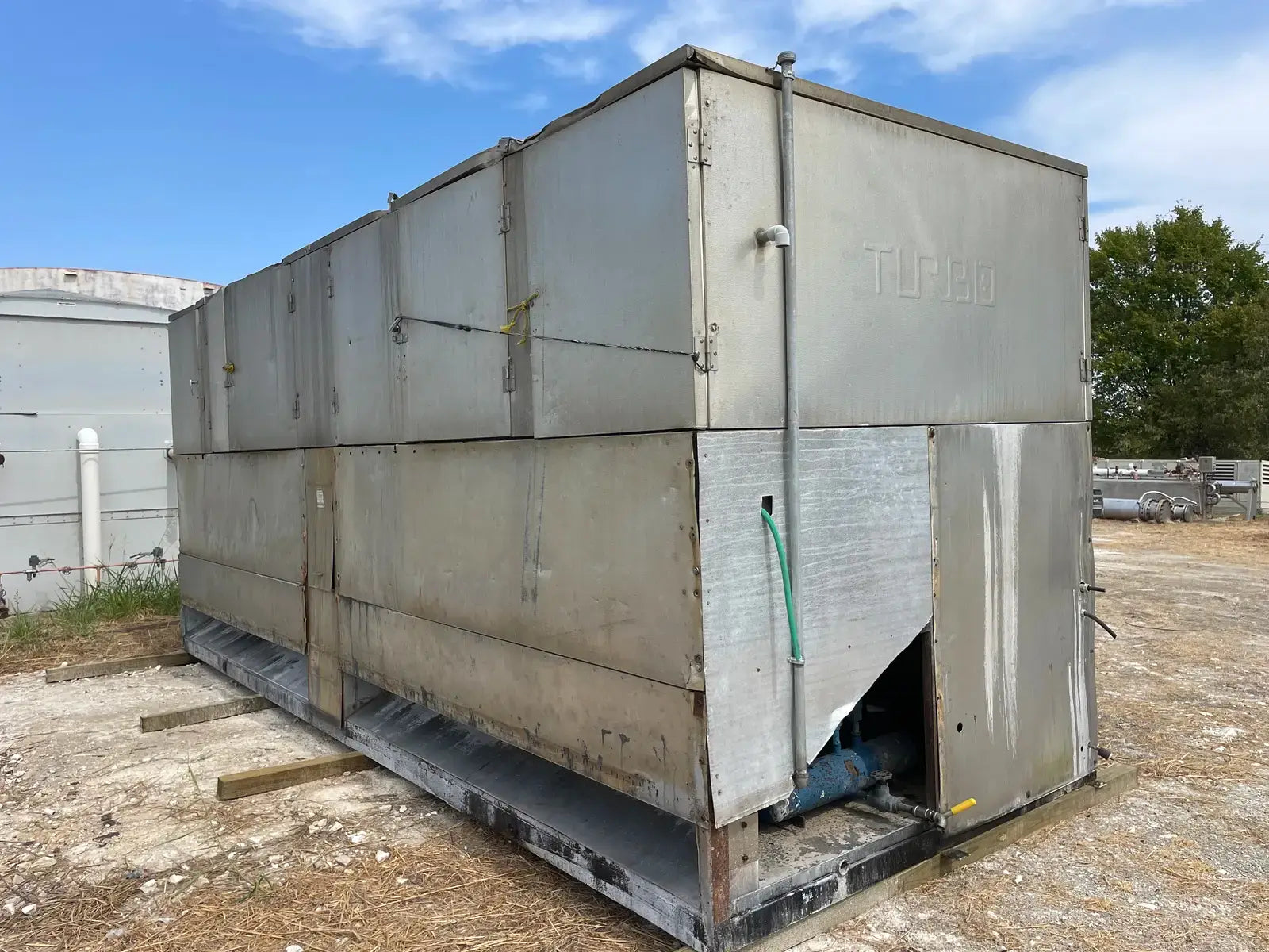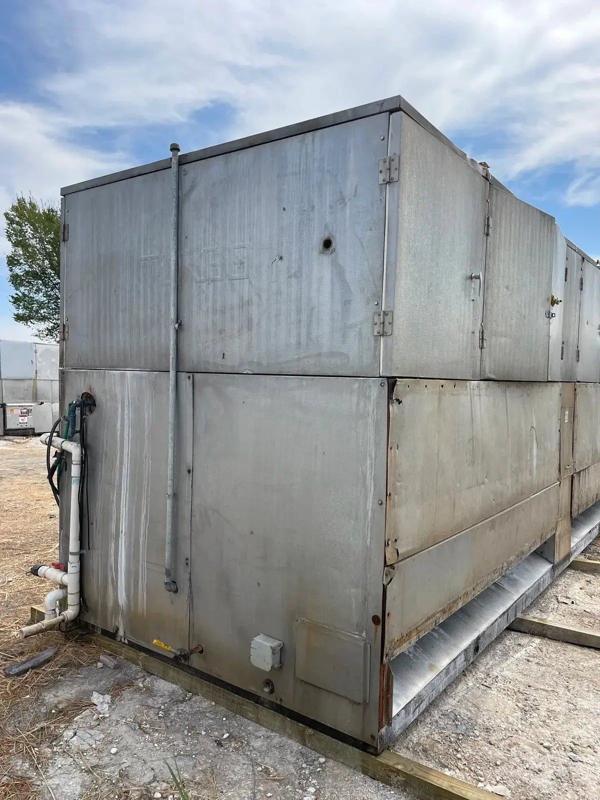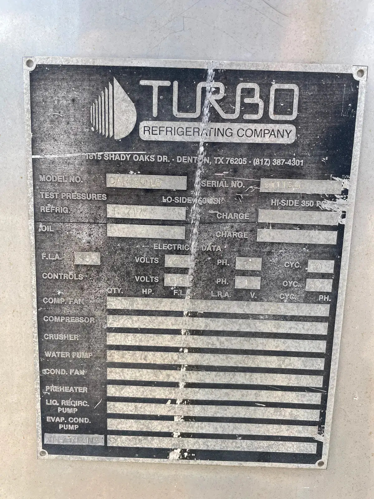 Turbo Ice Ice Maker. Model: CAR80LR. Serial No: 911150. Previous Refrigerant: R-717. Nominal Ice Capacity U.S. Tons(24 hrs): 40 Tons. Recommended Compressor Capacity TR @ 0 F Suction: 74.40. Breaker Bar(hp): (2) 3 Hp. Water Pump(hp): (4) 3/4 Hp. Defrost Water Flow(GPM): 30. Feed Water Connection: 2 in. Liquid Ammonia Flow: 30.0. Electrical Data - FLA: 38, Volts: 460, Ph: 3, Hz: 60. Controls - Volts: 115, Ph: 1, Hz: 60. Overall Dimensions(in): 256 L x 94 W x 110 H. Shipping Weight(lbs): 17040 LBS.