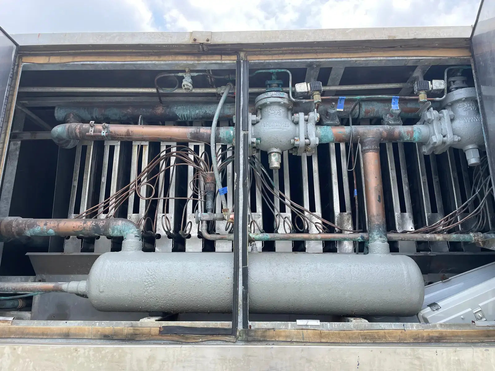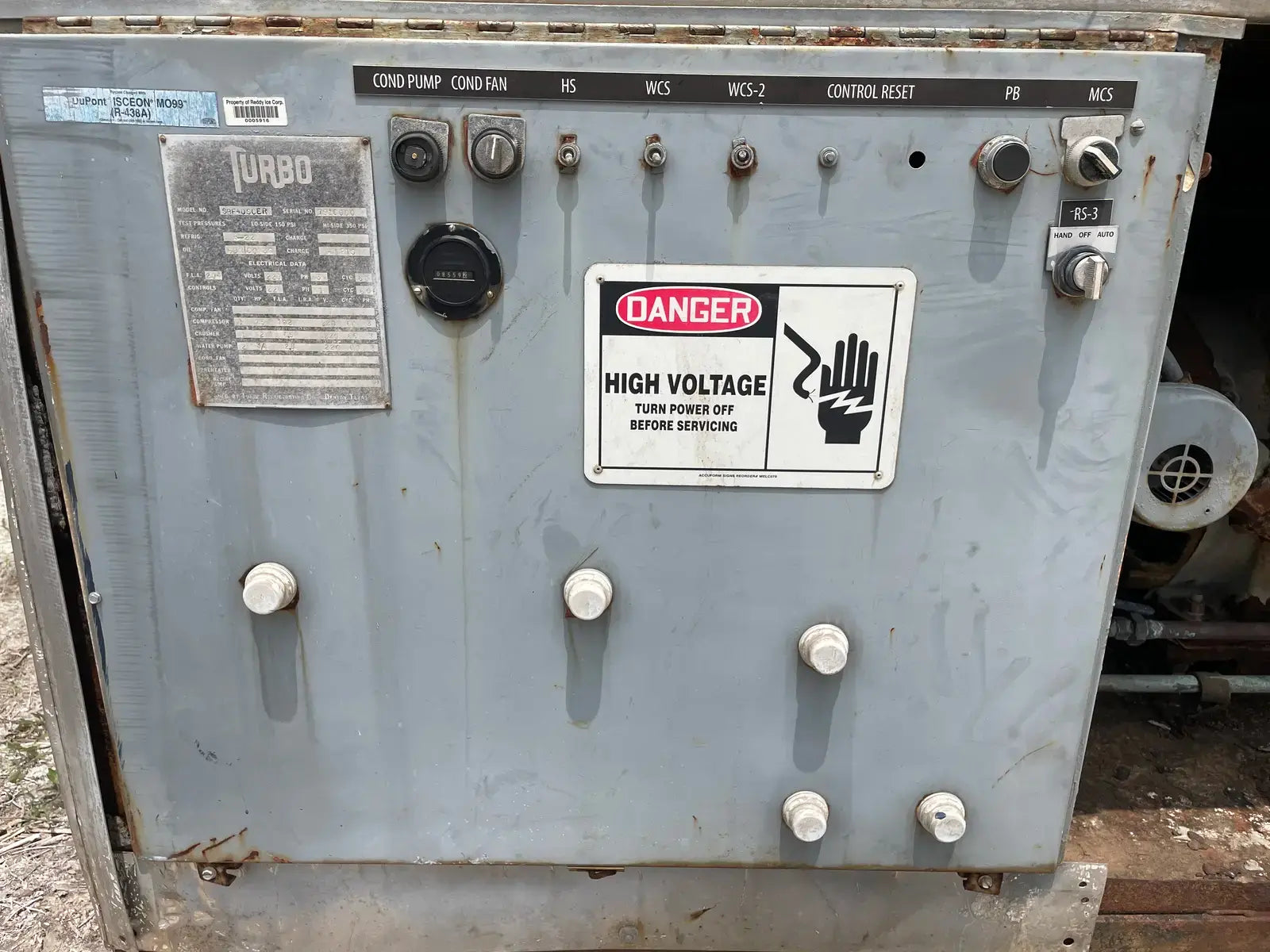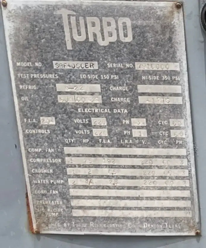 Turbo Ice Maker. Model: SBF40SCER. Serial No: 7916000. Refrigerant: R-22. Test Pressures: Lo-Side: 150 PSI. Hi-Side: 350 PSI. Electrical Data - FLA: 204, Volts: 229, PH: 3, Hz: 60. Controls: Volts: 220, Ph: 1, Hz: 60. Compressor(1): 75 HP, FLA: 192, Volts: 220, Hz: 60, PH: 3. Crusher(1): 2 HP, FLA: 5.5, Volts: 220, Hz: 60, Ph: 3. Water Pump(2): 3/4 HP, FLA: 2.8, Volts: 220, Hz: 60, PH: 3.