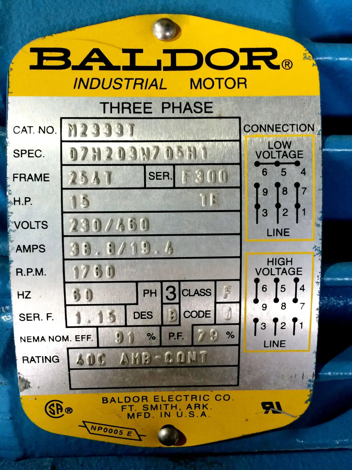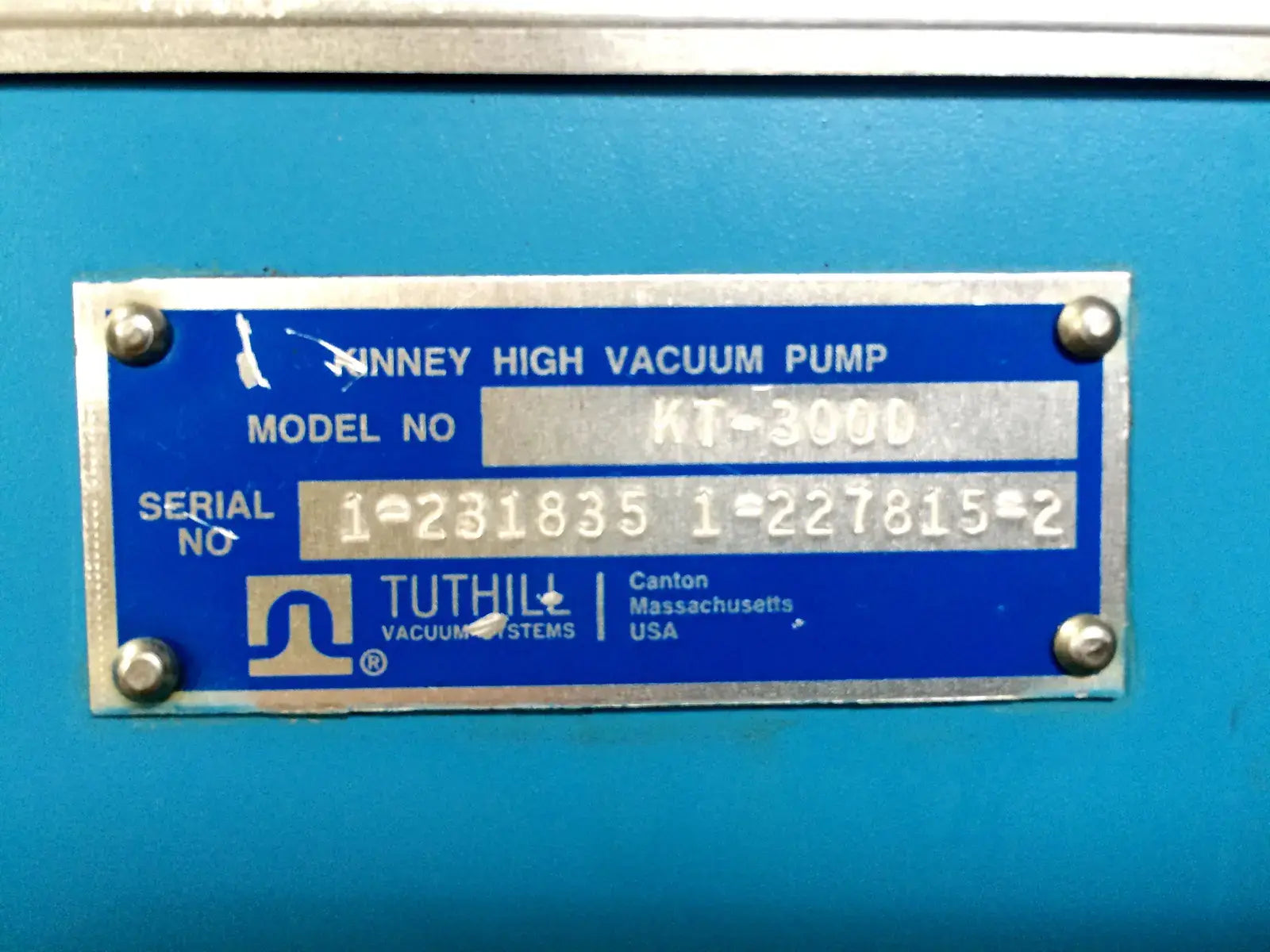 Tuthill Vacuum Systems Kinney High Vacuum Pump. Model KT-300D. S/N 1-231835, 1-227815-2. KT single stage rotary piston pump. Throughput: 300 CFM (510 M3/H). Applications: Transformer Oil Drying, Heat Treating, Coating, Metallurgy. Baldor motor: 15HP, 230/460V, 60 Hz, 3-phase. Overall dimensions: 36 in. L x 28 in. W x 52 in. H.