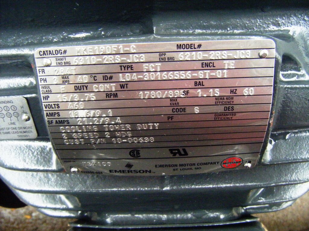 Un-Used Emerson Electric Motor- 15/3.75 HP. Model: 6210-2RS-JC3. Cat No: HKE190F1-C. Motor specifications: 1780/895 rpm, 460 V, 18.6/9.1 amps, 60 Hz, 3 phase. Frame: 284T. Continuous duty. Insulation class: F. Code: 6. Maximum ambient temperature: 104°F (40°C). Overall dimensions: 2 ft. 1-1/2 in. L x 1 ft. 7 in.W x 1 ft. 4-1/2 in. H.