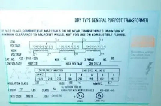 Un-Used Jefferson Electric Transformer-15 KVA. Cat No: 4223-3161-055. Dry type general purpose transformer. Class: AA, Code: N0210. 60 Hz, 3 phase. Low voltage: 480/277, High voltage: 208 delta. Insulation: 428°F, Rise: 302°F, % impedance: 6.7. Low voltage/connection; 218/1, 213/2, 208/3, 202/4, 197/5, 192/6, 187/7. Overall dimensions: 22 in. L x 17 in. W x 29 in. H.(H17).