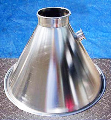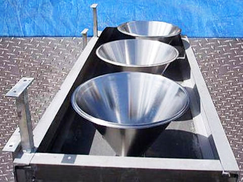 Un-Used Mueller Stainless Steel Drum Discharge Funnel. Inlets: (1) 21-1/4 in. infeed. Outlets: (1) 2 in. dia. S-line fitting, (1) 6 in. dia. S-line fitting. Overall dimensions: 23 in. L x 15 in. H.