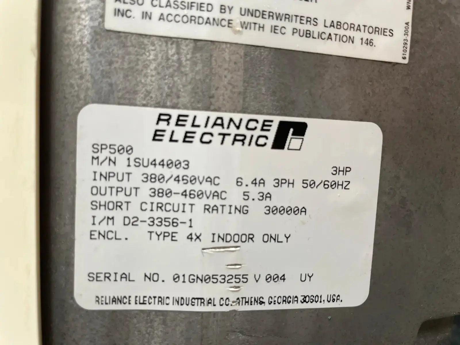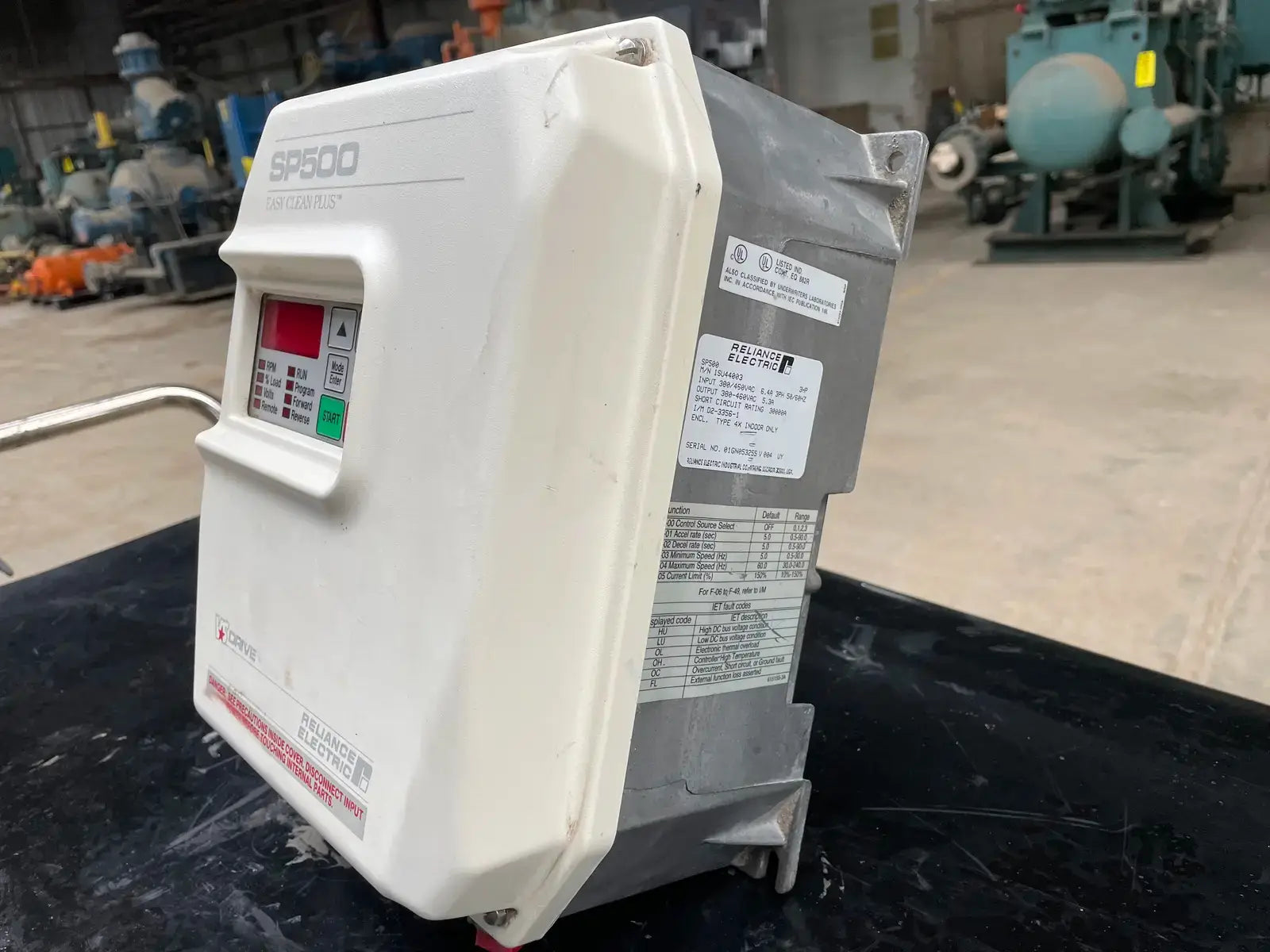 Un-Used Reliance Electric SP500 Easy Clean Plus Variable Frequency Inverter- 3 HP. Model: 1SU44003. S/N: 01GN053255 V 004 UY. Indoor use. Input: 380/460 Vac, 6.4 amps, 50/60 Hz, 3 phase. Output: 380/460 V, 5.3 amps. Overall dimensions: 8-1/2 in. L x 6-1/2 in. W x 12 in. H.