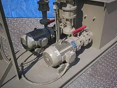 Un-Used Trane Process Cooling Chilled Water Pump Tank- 220 Gallon. Model: CTNK325. S/N: M40683-04/80. Tank dimensions: 36 in. L x 23-1/2 in. W x 60 in. H. Power supply: 460 V, 28.5 amps, 60 Hz, 3 phase. (2) Scot Pumps, Model: 54F, impeller diameter: 6 in., capacity: 192 gpm @ 120 tdh. Weg Motors: 10 hp, 3510 rpm, 208-230/460 V, 26.8-24.4 amps, 60 Hz, 3 phase. Water circulates from the pump tank to the chiller and then to the process via the recirculation pump. The standby pump is energized when there is a drop in the pressure. Inlets: (1) 1/2 in dia. FNPT water make-up ball valve, (1) 3 in. dia., 4-bolt flanged port. Outlets: (1) 3 in. dia., 4-bolt flanged port, (1) 3 in. dia. FNPT (overflow). Overall dimensions: 87-1/2 in. L x 41 in. W x 71 in. H.