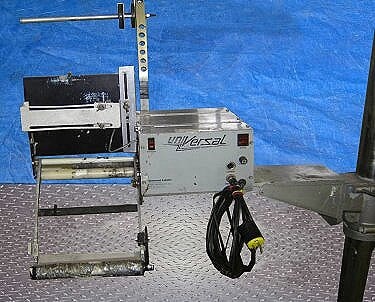 Universal Wipe-on Label Applicator with Adjustable Stand. Model: L15. Electric: 120 VAC= +/-10%. Heavy duty clutch brake, variable speed, photoelectric label sensing, optional start and stop delay. Speed: Up to 1200" Per Min, web width: up to 6.5 in., label roll capacity: up to 12 in. OD. Dimensions: 19.5 in. W x 21 in. D x 22.5 in. H.