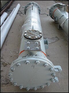 Unused 2010 EST Heat Exchanger, LLC Doubleguard Shell and Tube Heat Exchanger. Maximum flow rate 600 gpm. This unit produced 1,766,000 BTUH or 147 tons using an oil flow (outer tube) of 400 GPM and a water flow (inner tube) of 140 gpm with a 25° ΔT. (132) inner (waterside) 90-10 cupronickel tubes with 0.49 in. OD x 101.73 in. L, or approximately 145 sq. ft. of heating surface. (132) outer (oilside) copper tubes 0.75 in. OD x .040 AW x 98.25 in. L. or approximately 212 sq. ft. of heating surface. Shell MAWP: 50 PSI @ 200°F (50 PSI @ 0°F). Tube MAWP: 150 PSI @ 150°F (150 PSI @ 0°F). MDMT: -20°F. Featuring a concentric design and double tube sheet construction with the outer tube attached to the shell side and inner tube attached to an independent waterside head sheet, an inner air space between tube sheets allow any occurring leaking fluids to drain to the outside instead of contaminating the other. This “doubleguard” design is ideal for applications where there is a large pressure difference between product and media. (2) 6-1/2 in. inlets, (2) 4 in. outlets and (1) Swagelok air valve. Overall dimensions: 10 ft. 5 in. L x 2 ft. 4 in. W x 2 ft. 7 in. H.(ACN400).