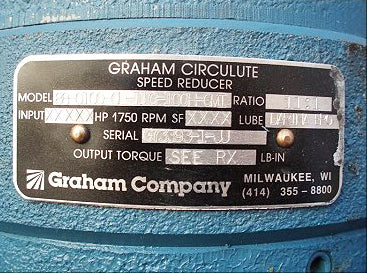 Graham Circulute Speed Reducer. Model: 88-0100-CL-11C-100H-GMI. Serial: G73393-1-JJ. Ratio: 11:1. Graham Company Wilwaukee WI USA. Graham Ring / Cone Variable Speed Controller. Input RPM: 1750. Output RPM: 0.9-90.9. Output torque: 2170 / 513 (low/high speed). Oil: RX Traction. Graham Control Box: style: 3, NEMA: 4 remote point, spec 7339-02. This was last installed with a Waukesha 015 rotary lobe positive displacement pump. Unit appears to be unused.