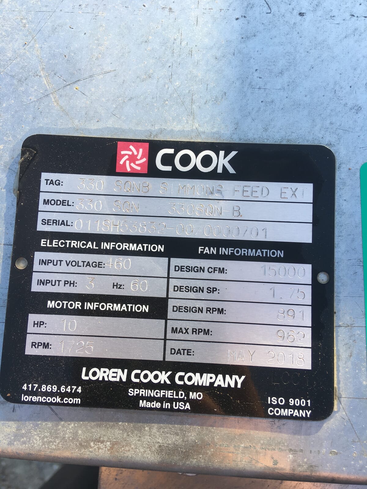 Unused 330SQN-B Centrifugal Fan. Model: 330 SQN 330SQN-B, Serial: 011SH53832- 00/0000701. Electrical Information: Input Voltage: 460, Input Ph:3, Hz: 60. Fan Information: Design CFM: 15000, Design: 1.75, Design RPM: 891, Max Rpm 962, MFG Date: April 2018.