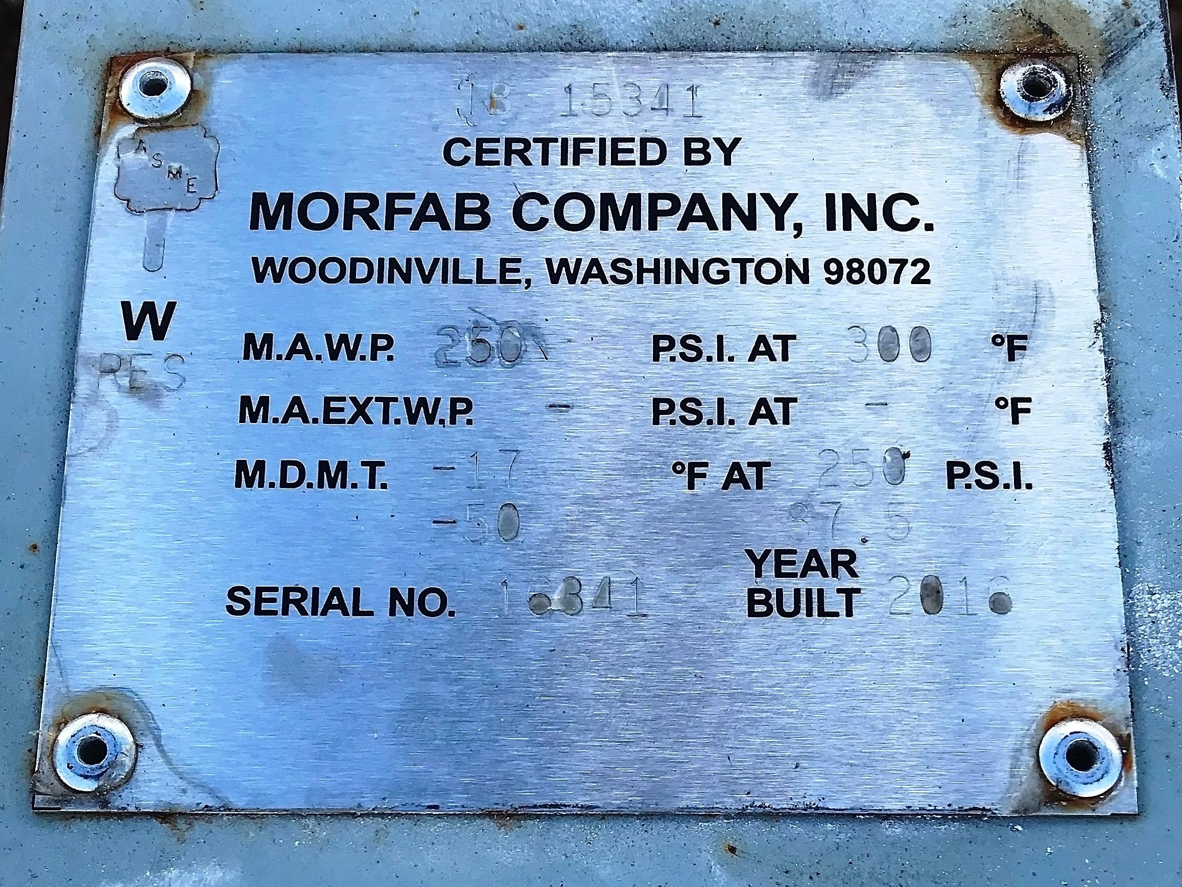 Unused Morfab Horizontal Ammonia Thermosyphon Vessel. Cerified by Morfab Company, Inc. Nat'l Bd. no.: 15341. Serial: 16341. Year: 2016. MAWP: 250 PSI at 300F. MDMT: -17F at 250 PSI, -50F at 87.5 PSI. Ports (left to right, inches): Top 2, 3, 2.5, 3, 0.75, Bottom 0.75, 3, 2, 5, 1. Diameter: 16 in. Sidewall length: 74 in. Approximate volume: 65 gallons.