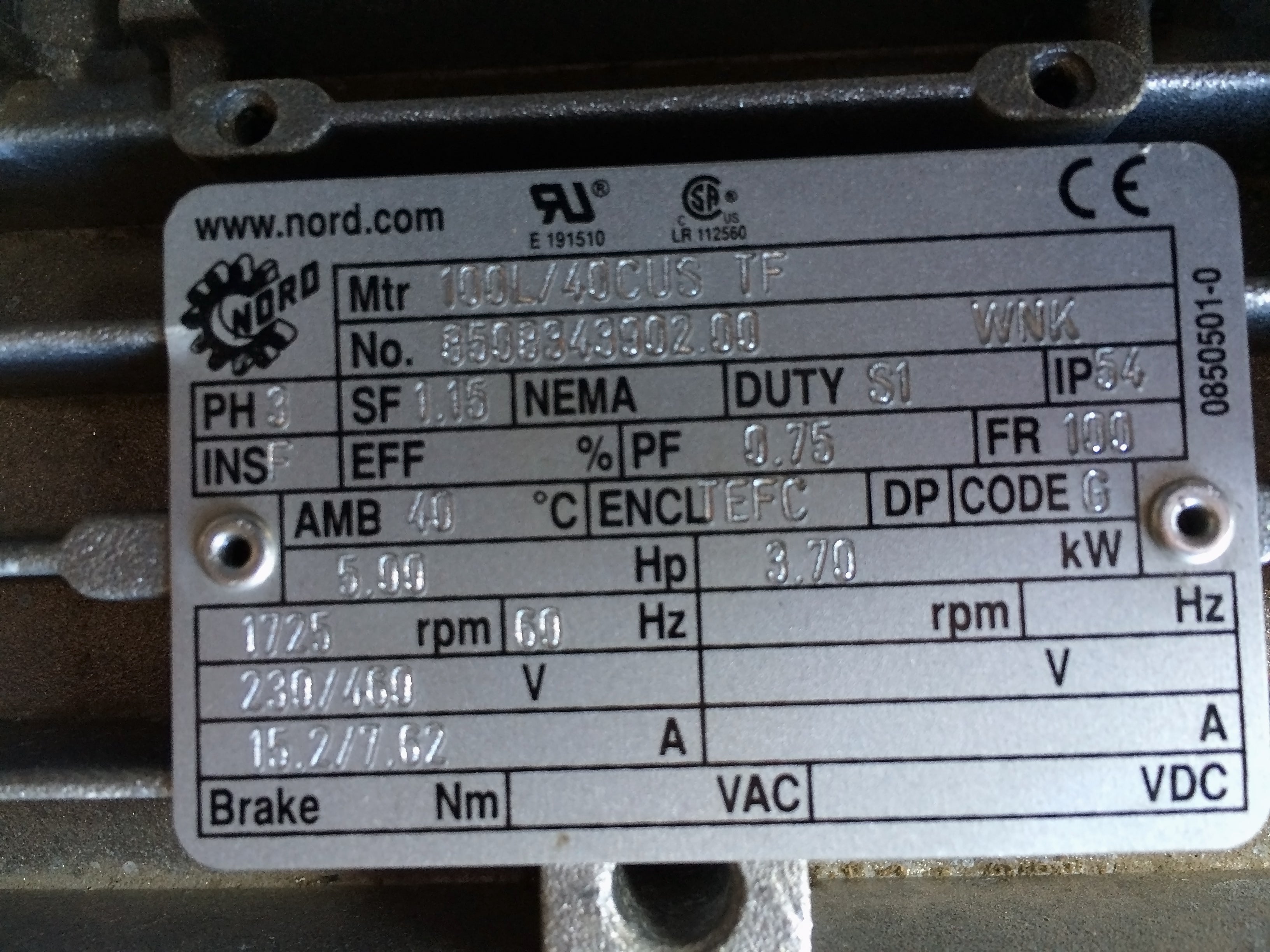 Unused Nord Electric Motor. Model: 100L/40CUS TF. Serial: 8508343902.00 . 5 HP, 1725 RPM, 230/460V, 15.2/7.62 Amps, 3.7 kW, 60 Hz, 3-phase, TEFC, Frame 100.