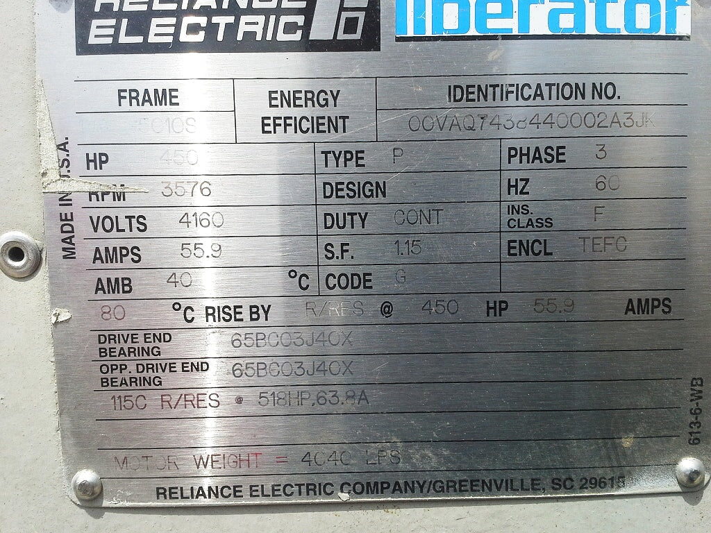 Unused Reliance Electric Liberator Motor: 450 HP, 3576 RPM, 4160V, 55.9 Amps, 60 Hz, 3-phase, G5010S Frame, Code G, 1.15 S.F., CONT Duty, TEFC Enclosure. Motor weight: 4,040 lbs. Quantity available: 1.
