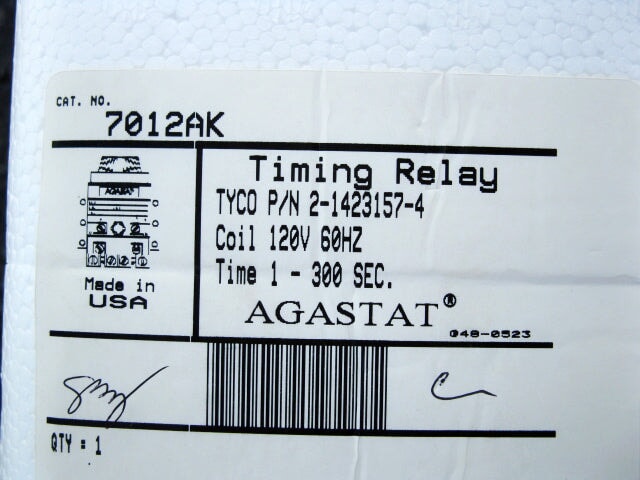 Unused Tyco Agastat Timing Relay. Model: 7012AK. Time: 1-300 seconds. Coil: 120v, 60 Hz. Overall dimensions: 2-1/2 in. L x 2-1/2 in. W x 4-1/2 in. H.