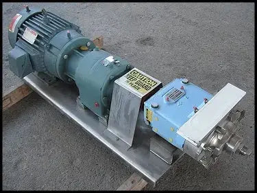 Waukesha Positive Displacement Pump. Model 34. S/N: 251580 99. Flow rate for a new pump is 24 gpm at max rpm of 600. Discuss with salesperson your process and product to determine if this pump should handle your specific duty. Pump currently has single mechanical seals. Drive and pump seals can be changed to suit your application. Reliance Electric Duty Master motor: 3/1.5 hp, 1765/880 rpm, 460 V, 4.60 amps, 60 Hz, 3 phase. Dodge gearbox: Output of 350 rpm with 1750 rpm input, 5.0 ratio. Ports (2): (1) flange of 6 ¾ in. x 1 13/16 in. opening and 12 in. x 3 1/8 in. outside dimensions, (1) 1 ½ in. S-line clamp fittings. Overall dimensions: 4 ft. 4 in. L x 1 ft. 3 in. W x 1 ft. 4 in. H.(ACN76).