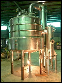Vacuum Pan Evaporator. Removed from a major US food manufacturer. Stainless steel jacketed mix tank with bottom sweep agitator. Manufacturer: Plumbing & Stainless Steel Works, LTD Montreal. Internal diameter: 71.5 in. Straight wall height: 56 in. Estimated capacity: 1,000 gallons (130 cubic feet). Tank nameplate: P.S.S.W. No. 100, REG No 1821.6, SH 1/4 S/S, HD 5/16 S/S, HD ¼ F.B., WP 25, UW52-B-WELD-C. Overall tank dimensions: 84 in. dia. x 124 in. H. Stainless steel shell and tube heat exchanger with hinged/gasketed end caps. Tube dia.: 1.425 in. Tube length: 49 in. Tube Qty: 55. Estimated surface area of tubes: 84 sq. ft. Shell diameter: 16 in. Shell sidewall length: 63 in. Shell ports: 4.5 in. with 8-bolt flange, 1.5 in. NPT. Heat exchanger overall dimensions: 34 in. x 34 in. x 106 in. High. Stainless steel shell and tube heat exchanger. Tube diameter: 0.875 in. Tube length: 83 in. Tube Qty: 183. Estimated surface area of tubes: 290 sq. ft. Shell diameter: 20 in. Shell sidewall length: 97 in. Lower chamber: 24 in. dia x 57 in. high (estimated 110 gallons / 15 cubic feet). Shell ports: (2) 2 in. 4-bolt flanges. Tube ports: 9.5 in. 9-bolt flange, 0.5 in. NPT. Heat exchanger overall dimensions: 36 inch x 36 inch x 166 inches High.