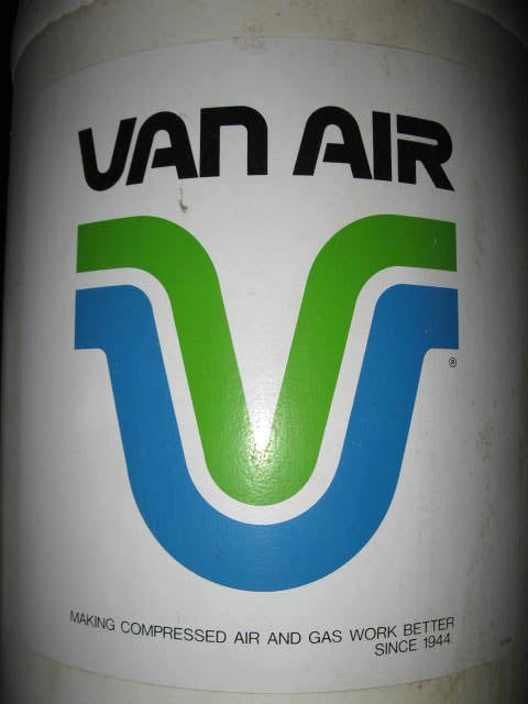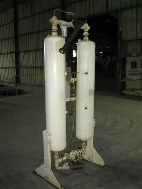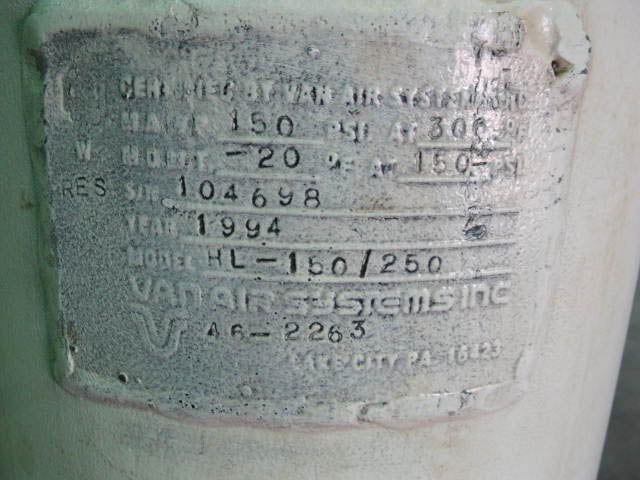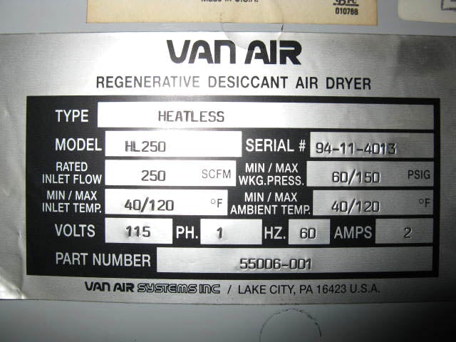 1994 Van Air Inc. Heatless Regenerative Compressed Air Dryer with Cycle Saver™ Controller. Model: HL-250. Capacity: 250 scfm. Overall tank dimensions: 17-1/2 in. dia x 54 in H. Van Air HL series heatless dryers offer protection of compressed air operated equipment and processes with features including continuous and sequential flow cycles at constant pressures, full automation, activated alumina desiccant, panel mounted tower pressure gauges and a panel mounted moisture indicator. The Cycle Saver™ controller Includes switching failure monitor LED and contact and minimizes purge to actual moisture load conditions for maximum savings, low operating cost and a -40°F dew point. Overall dimensions: 3 ft. 1 in. L x 2 ft. W x 7 ft. 7 in. H.(ACN125).