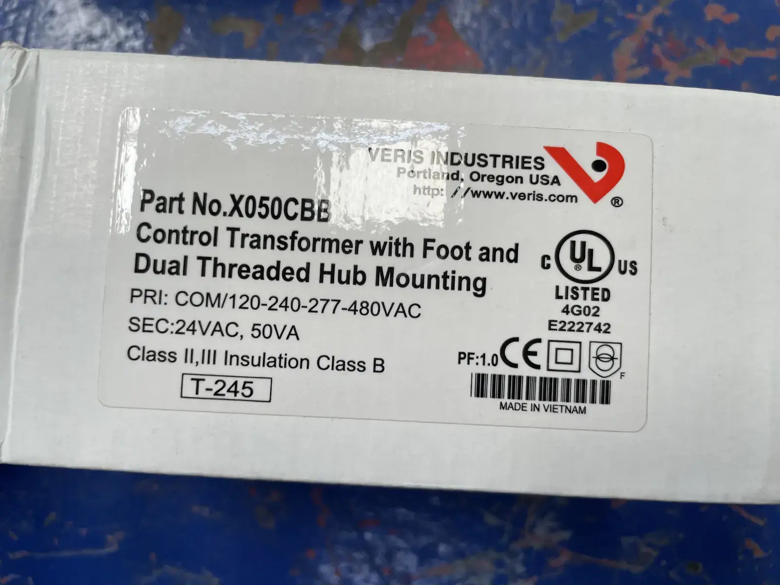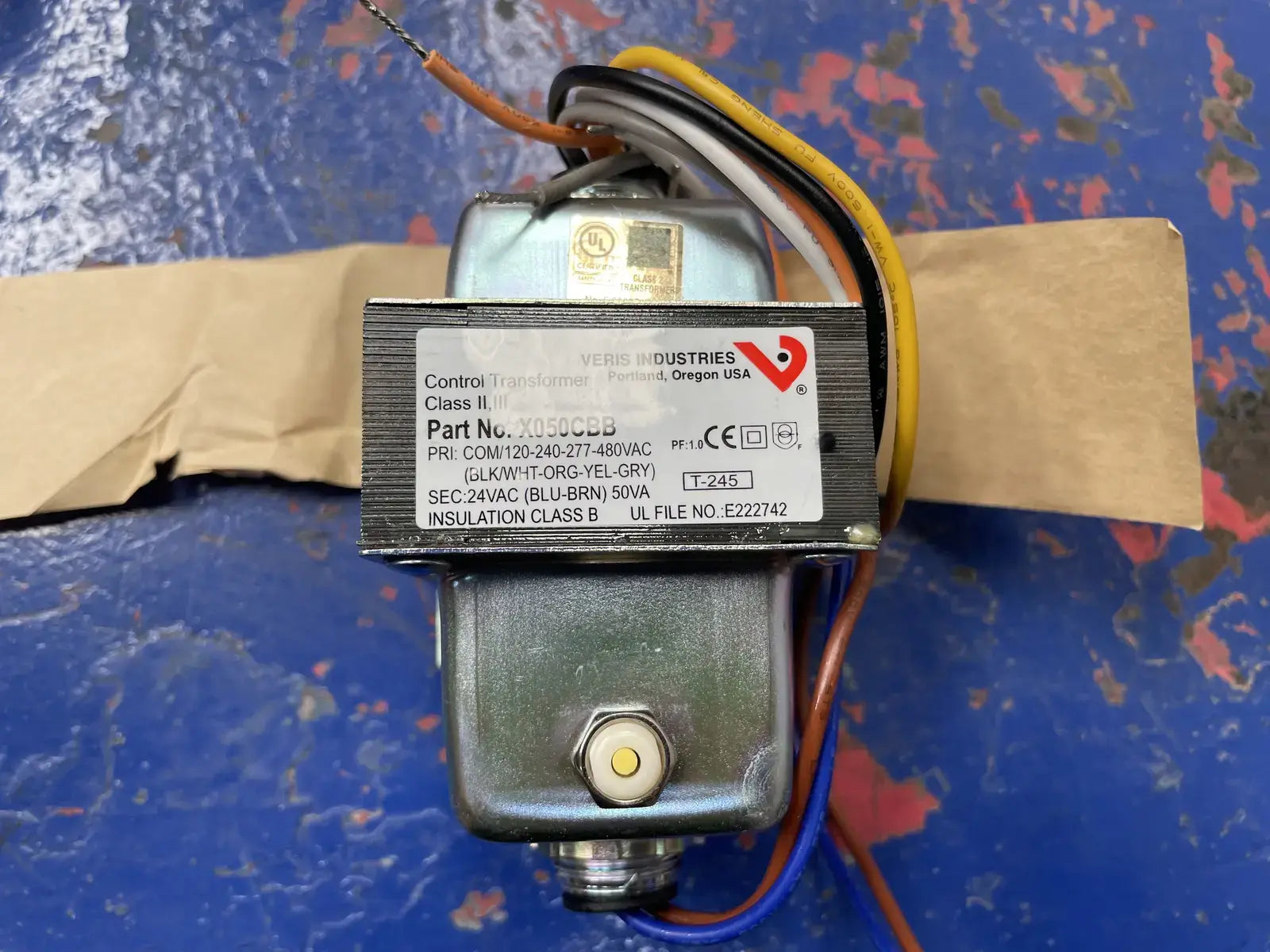 Veries Industries Control Transformer with Foot and Dual Threaded Hub Mounting. Part No: X050CBB. Power Output - 120-240-277-480 VAC. SEC: 24VAC, 50VA.