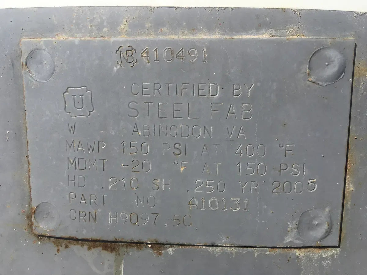 2005 Vertical IGR Air Expansion Tank. Designed for extra air storage & made with Steel. Certified By Steel Fab: Abingdon, Va. MAWP: 150 PSI @ 400 F, MDMT -20F @ 150 PSI, HD/.210 SH/.250, Year Mfg: 2005, Part No: A10131, Rn: H9097.5C
