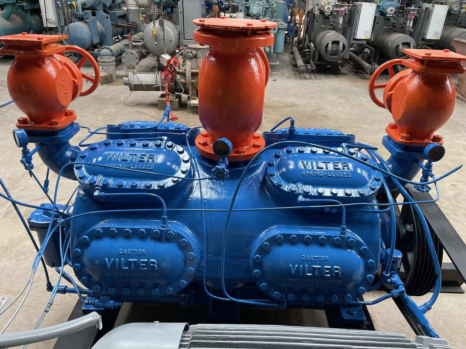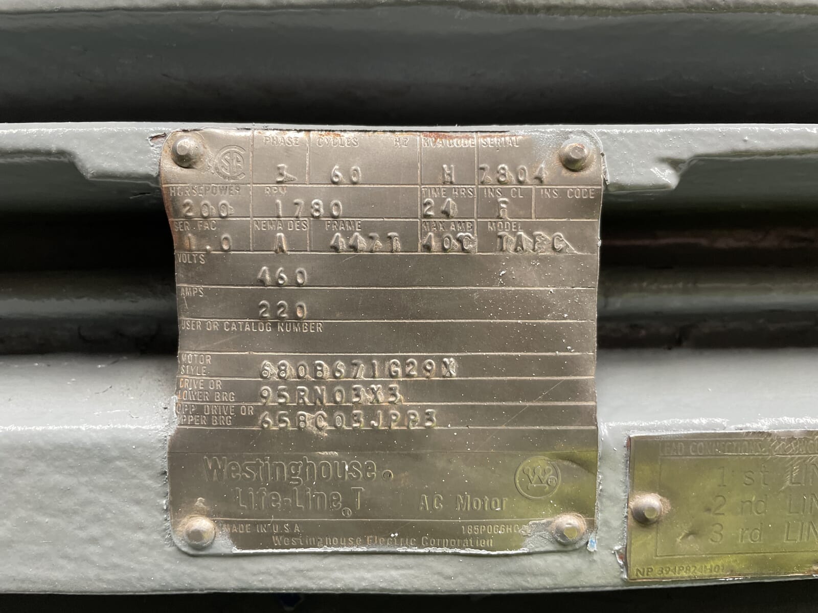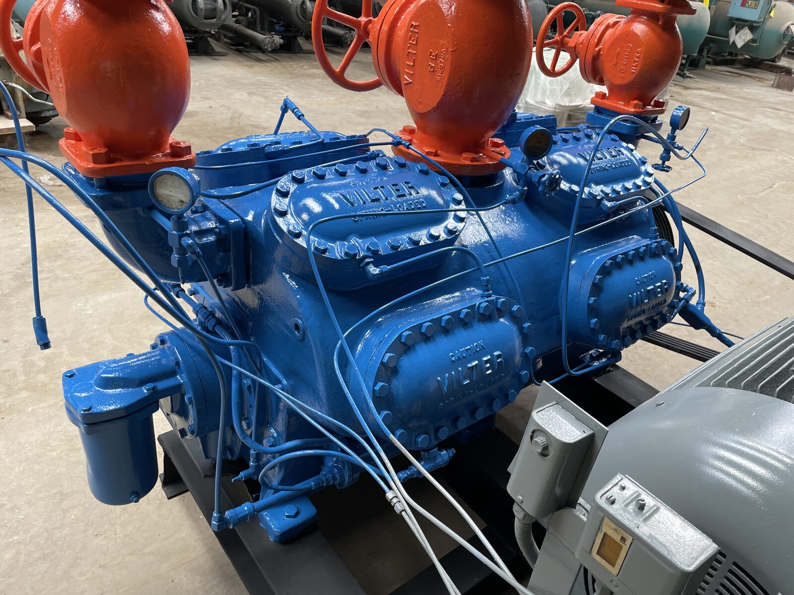 Vilter 4416 16-Cylinder Reciprocating Compressor. The compressor is missing the data plate. Number of Cylinders: 16, Maximum RPM: 1200, CFM @ Maximum RPM: 597(1014). Suction Connection: 5 inches. Discharge Connections: Two 3 Inches. Westinghouse AC Motor - HP: 200, RPM: 1780, Hz: 60, PH:3, Frame: 447T, Max AMS: 40c, Volts: 460, AMPS: 220.