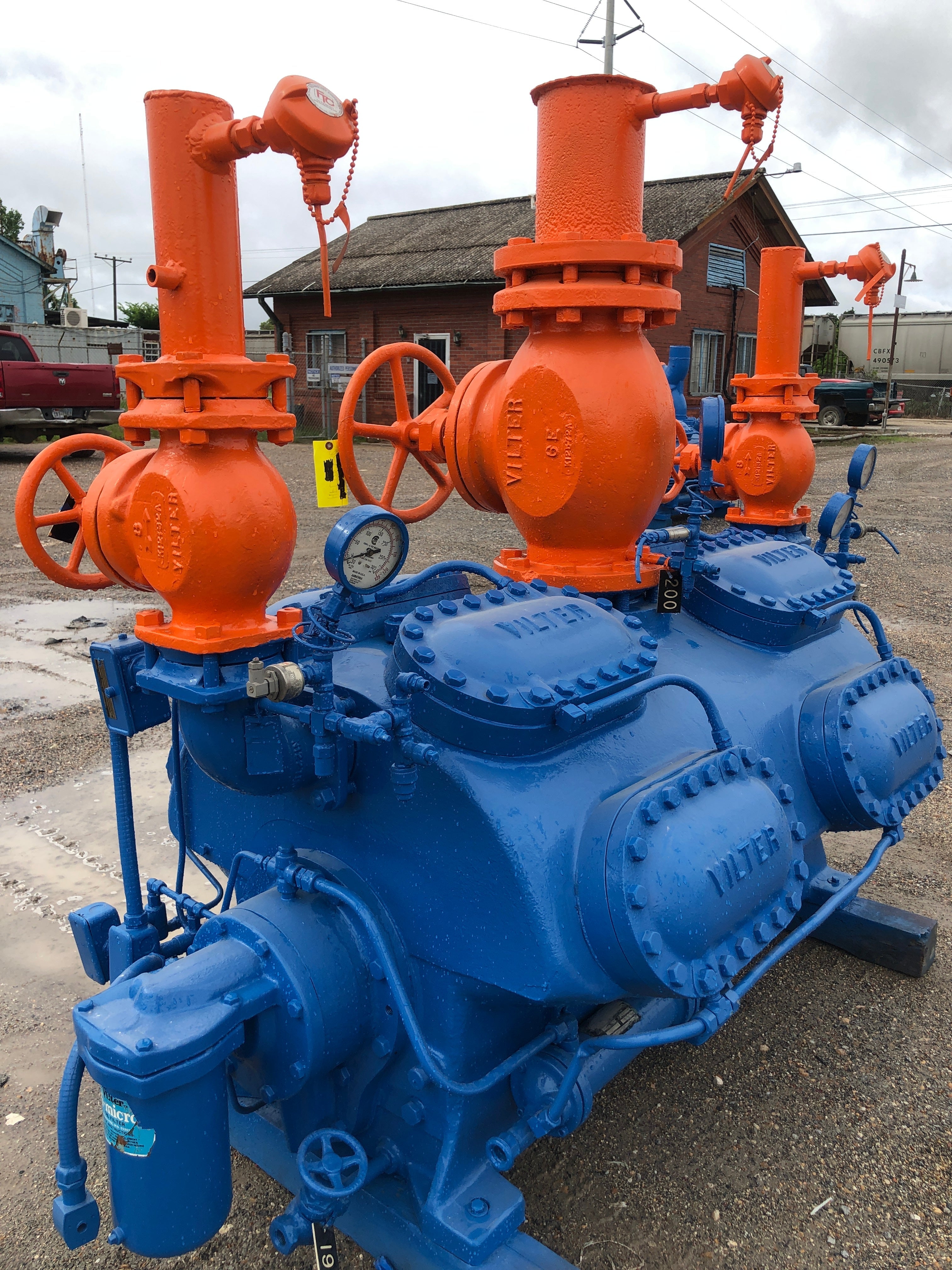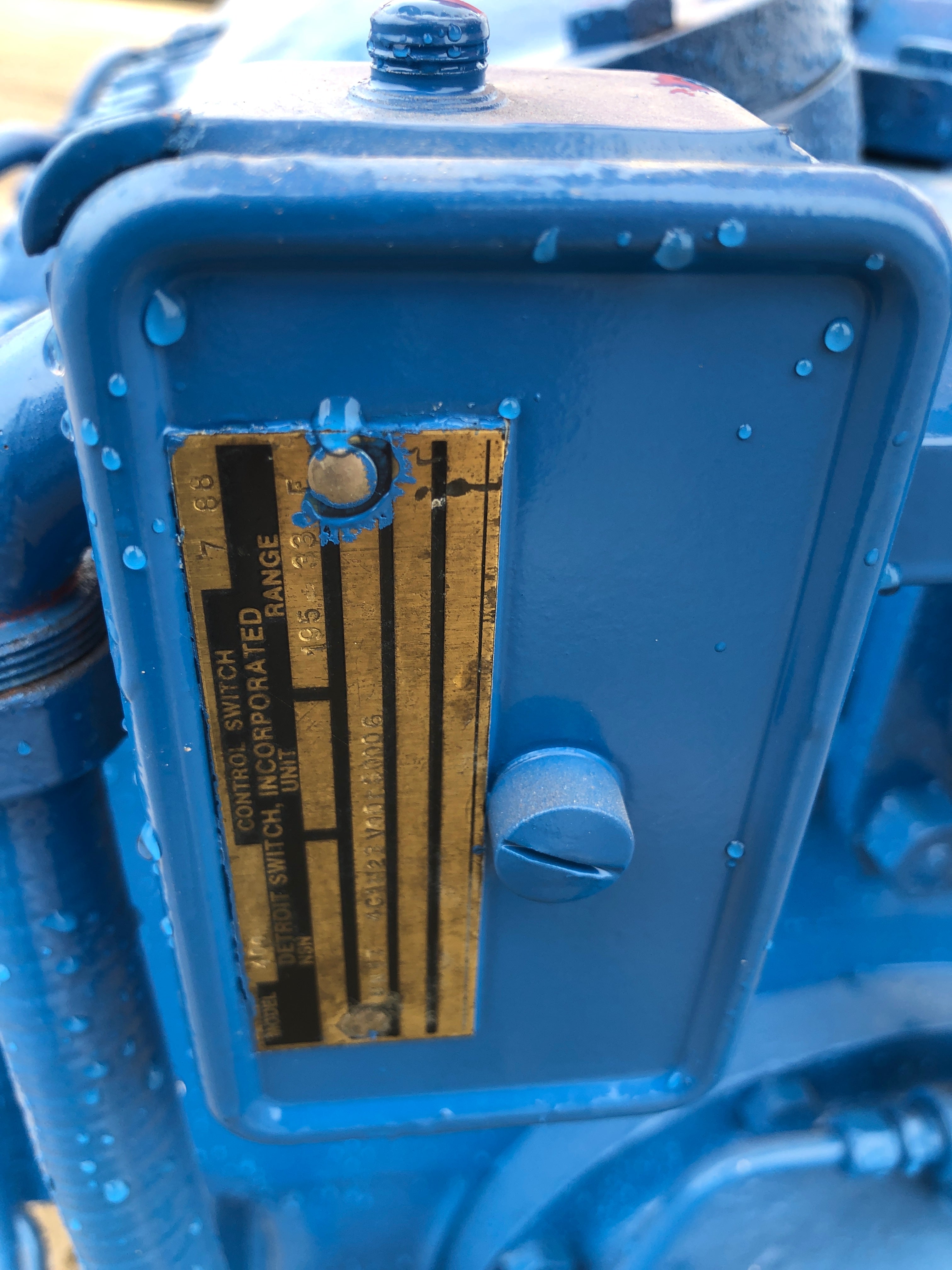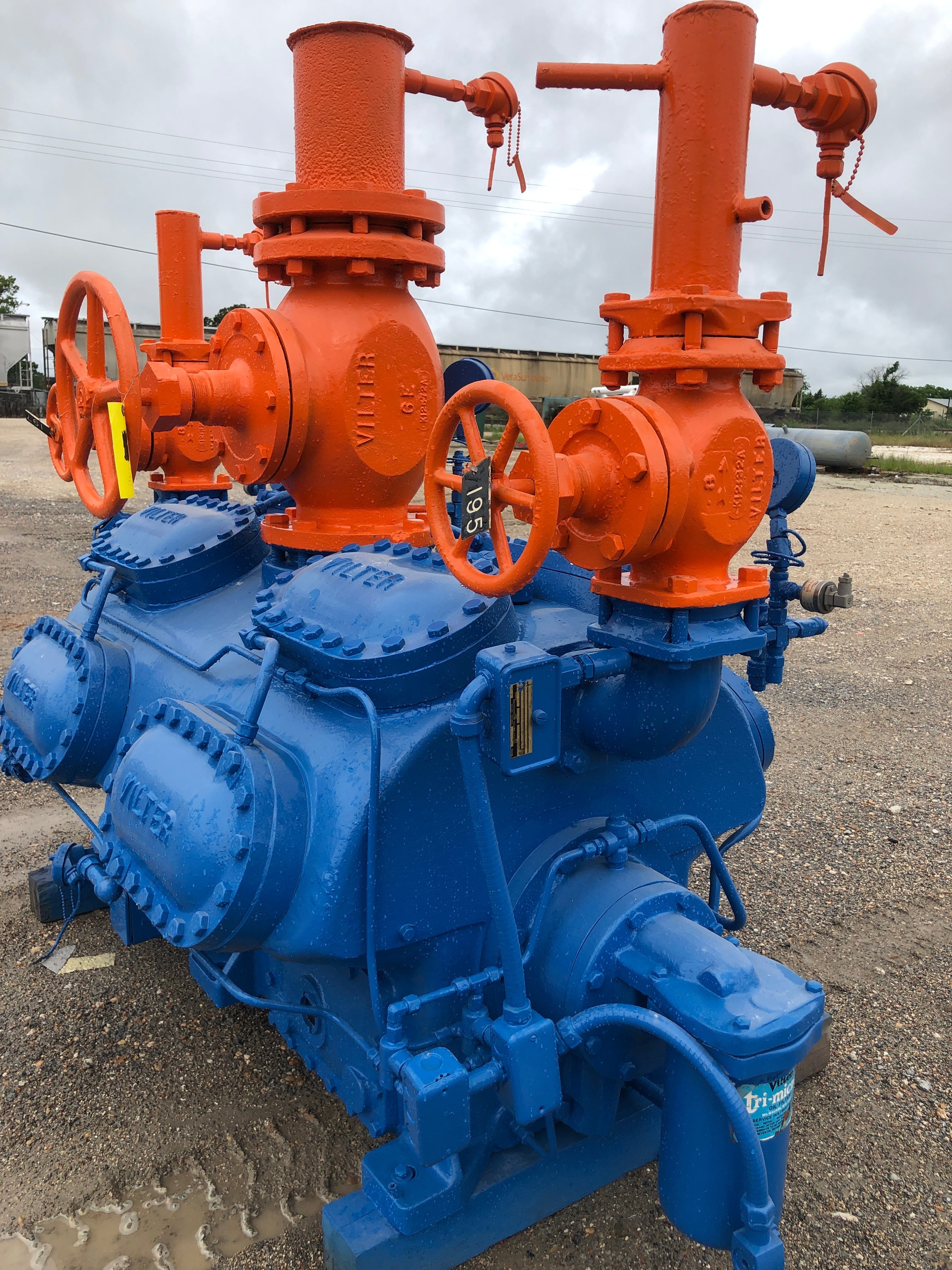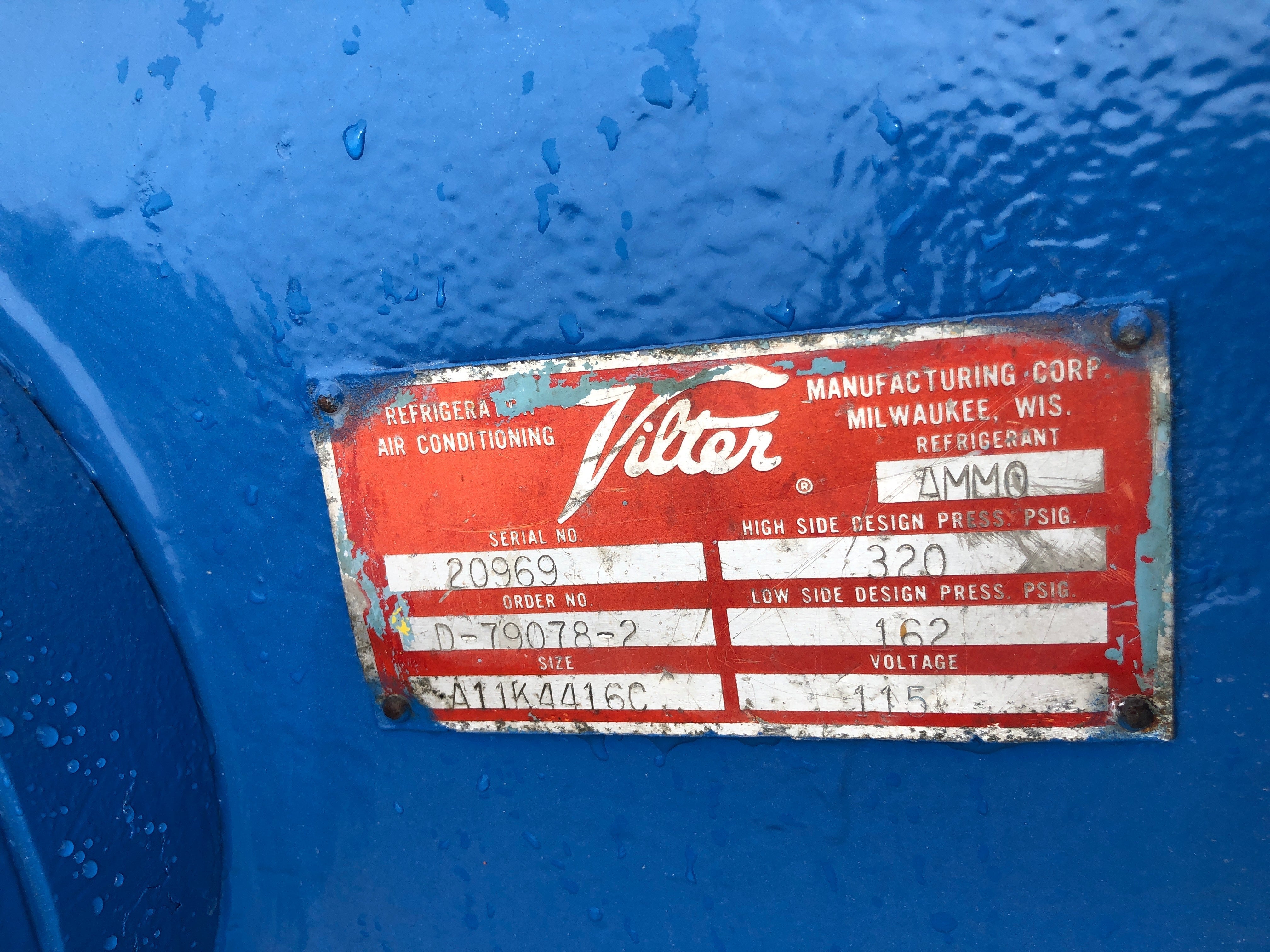 Used Vilter 4416 16-Cylinder Bare Reciprocating Compressor. Serial: 20969. Order No.: D-79078-2. Refrigerant: AMMO (ammonia, R717). Low/High Side Design pressure: 162 / 320 PSIG. Voltage: 115V. Number of cylinders: 16. Ports: 6 in. suction, (2) 3 in. discharge.
