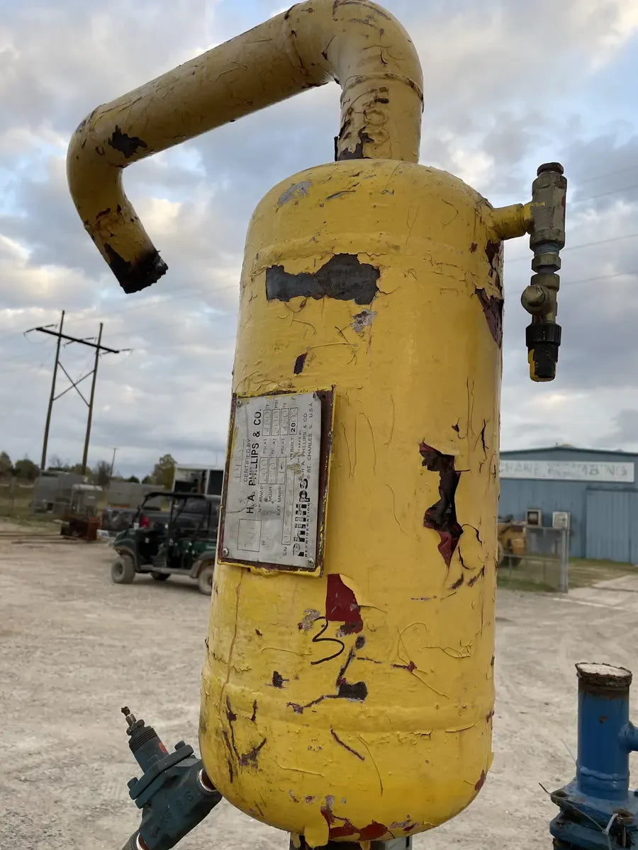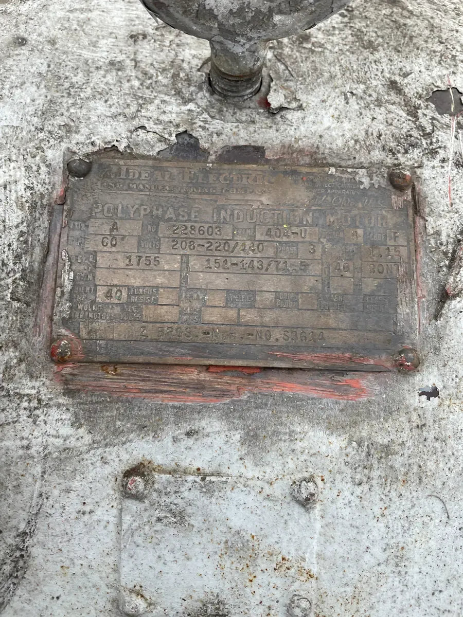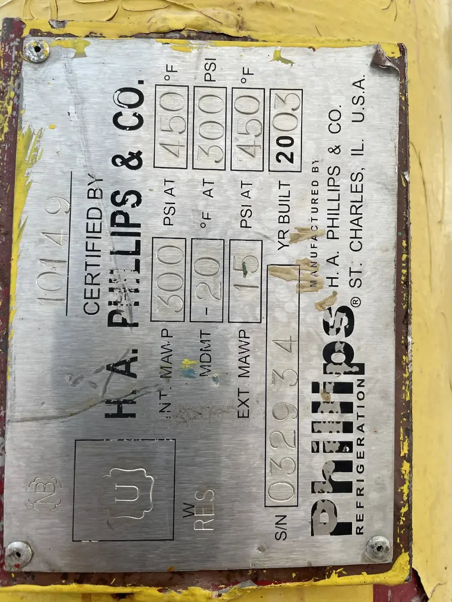 Vilter 446 6-Cylinder Reciprocating Compressor - Model 446, Serial: 3240A RC, Cylinders: 6.Displacement at Max RPM (CFM): 232, Maximum RPM: 1200. Oil Charge(Gallon/Liter): 7(27), Maximum Discharge Temp : 300(1490), Crankcase of Temp Range C: 43-54, Compressor Connections (Line Size-Inches) - Suction: 4 (101.6mm) Discharge: 3 (76.2 mm) Ideal Polyphase Induction Motor - Type: A, Serial No: 228603, Frame: 404-U, HP: 60, Volts: 208-220/140, PH: 3, RPM: 1755, AMP: 151-143/71.5. Phillips Refrigeration Oil Separator - Certified by H.A. Phillips & Co: National Board No: 10149, INT.MAWP: 300 PSI @ 450 F, MDMT: -20F @ 300 PSI, EXT MAWP: 15 PSI @ 450 F, Serial No: 032934, Year Built: 2003.