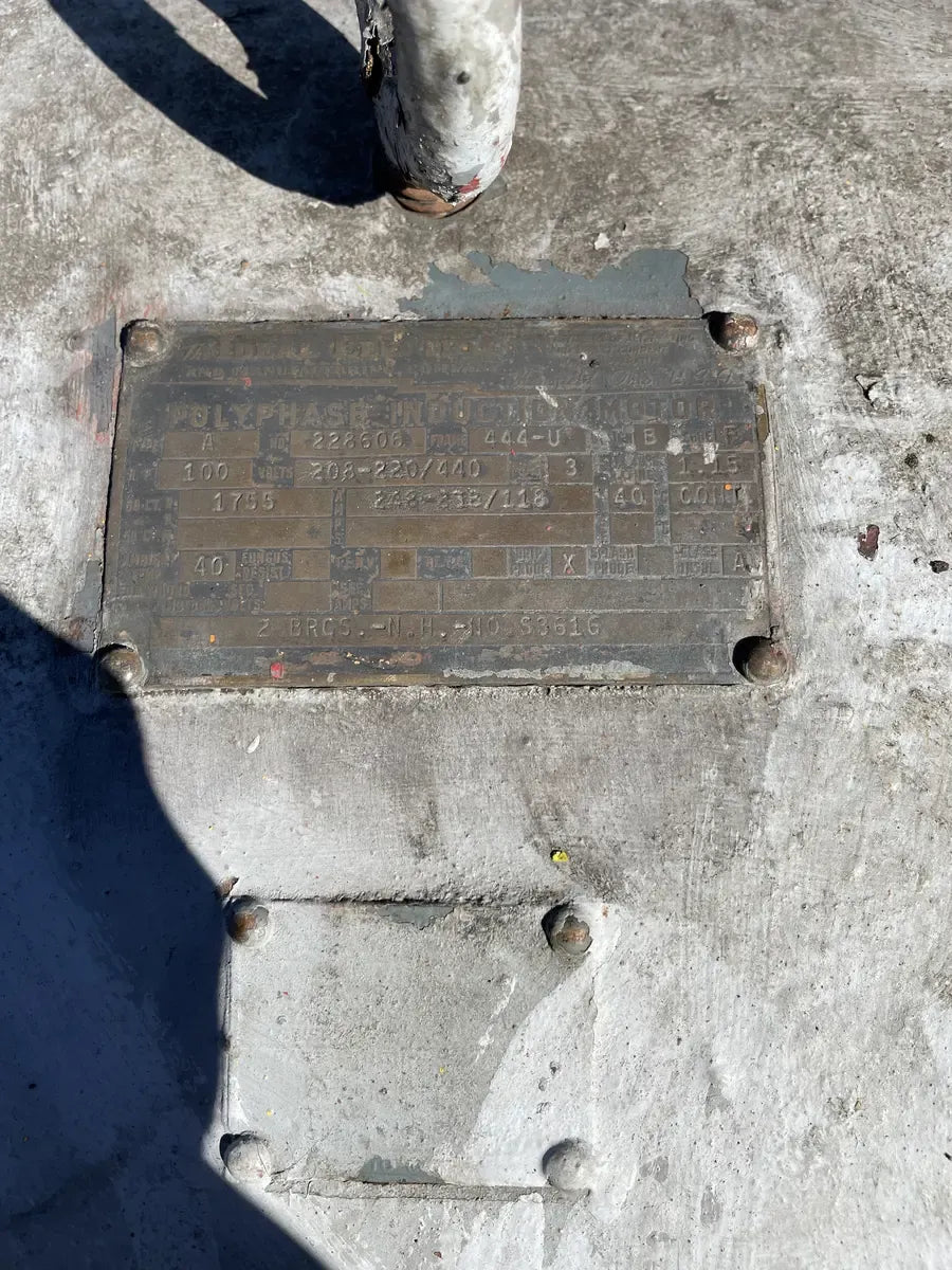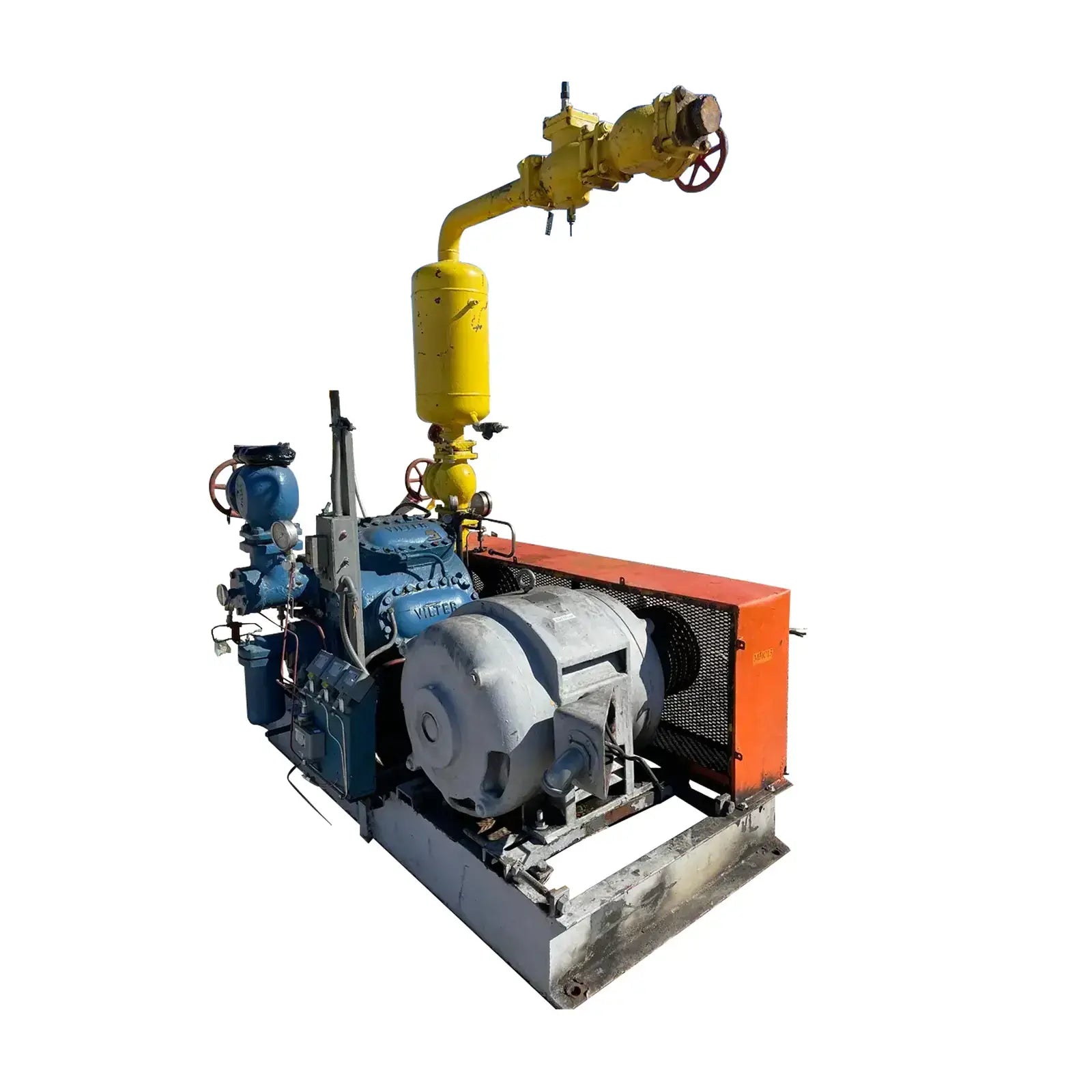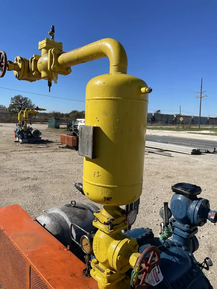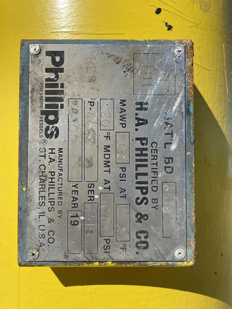 Vilter 448 8-Cylinder Reciprocating Compressor: Model: AK44BR, Serial No: B985941, Mfg Year: 2004. Ideal Polyphase Induction Motor - Type: A, Serial No: 228606, Frame: 444-U, HP: 100, Volts: 208-220/440, AMPS: 24.8/118, AMB Temp: 40, Duty: Cont. Phillips Oil Separator - National Board: 6418, MAWP 300 PSI @ 250F, MDMT -20 @ 300 PSI, Serial No: 6418, Mfg Year: 1994, Certified by H.A Phillips & Co