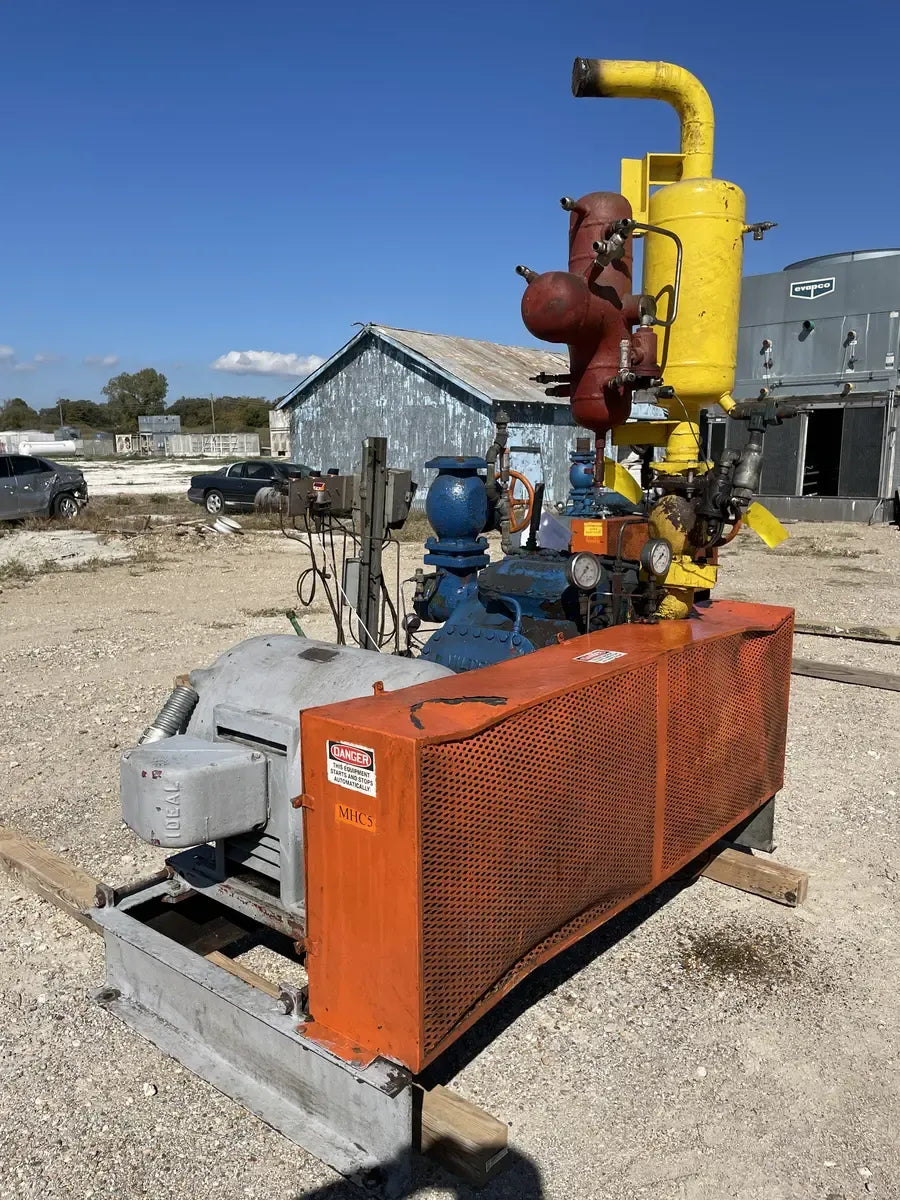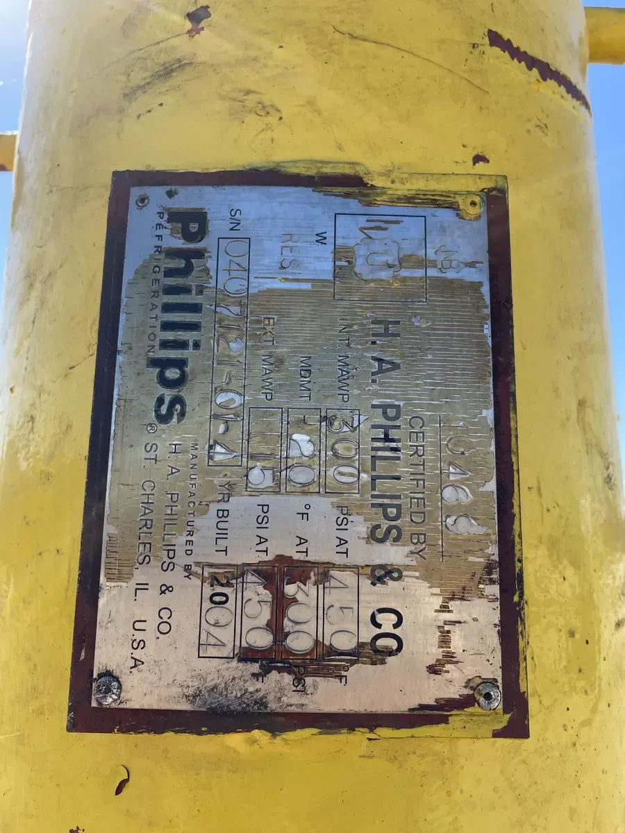 Vilter 448 8-Cylinder Series Reciprocating Compressor. Model: 448, Cylinders: 8, Serial No: 5033 A RC, Order No: B985948. Displacement At Max RPM (CFM): 209, Mfg Year: 2005. Compressor Connections(Line Size-Inches): Suction: 4, Discharge: 3. Nominal capacity: 73.8 Tons of R-717 at 32.6 BHP with a 61.1°F condensing temperature and a 30°F suction temperature. Displacement: 155 cfm (at maximum rpm). Maximum rpm: 1200. Maximum discharge pressure: 300 (PSIG). Maximum discharge temperature: 300°F. Maximum BHP with V-belt drive: 100 BHP. Maximum suction pressure: 150 psi. Ideal Electric Induction Motor: Type: A, HP: 100, Frame: 444-U, Volts: 208-220/440, Amps: 248-236/118, PH: 3, RPM: 1755 Phillips Refrigeration Oil Separator - INT MAWP: 300 PSI @ 450F, MDMT: -20F @ 300 PSI, Ext MAWP: 15 PSI @ 450F, Serial No: 0407121-01-4, Year Built: 2004.