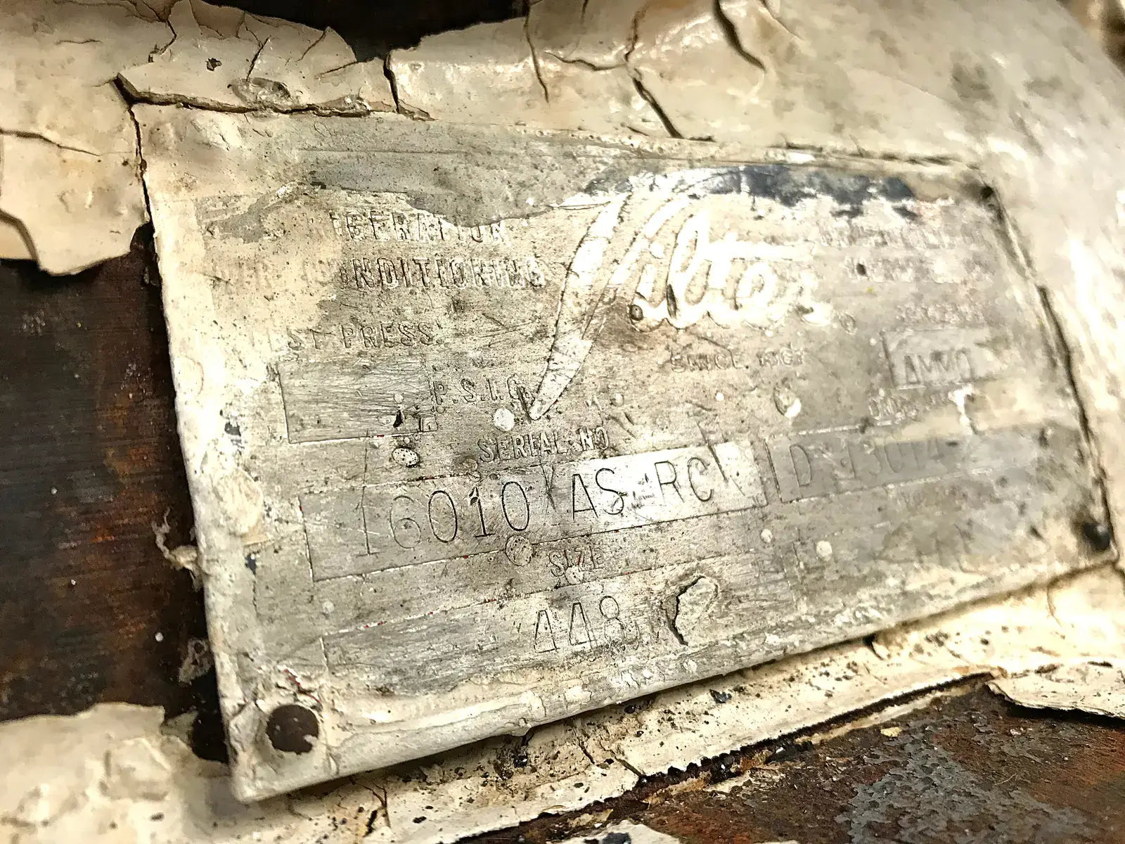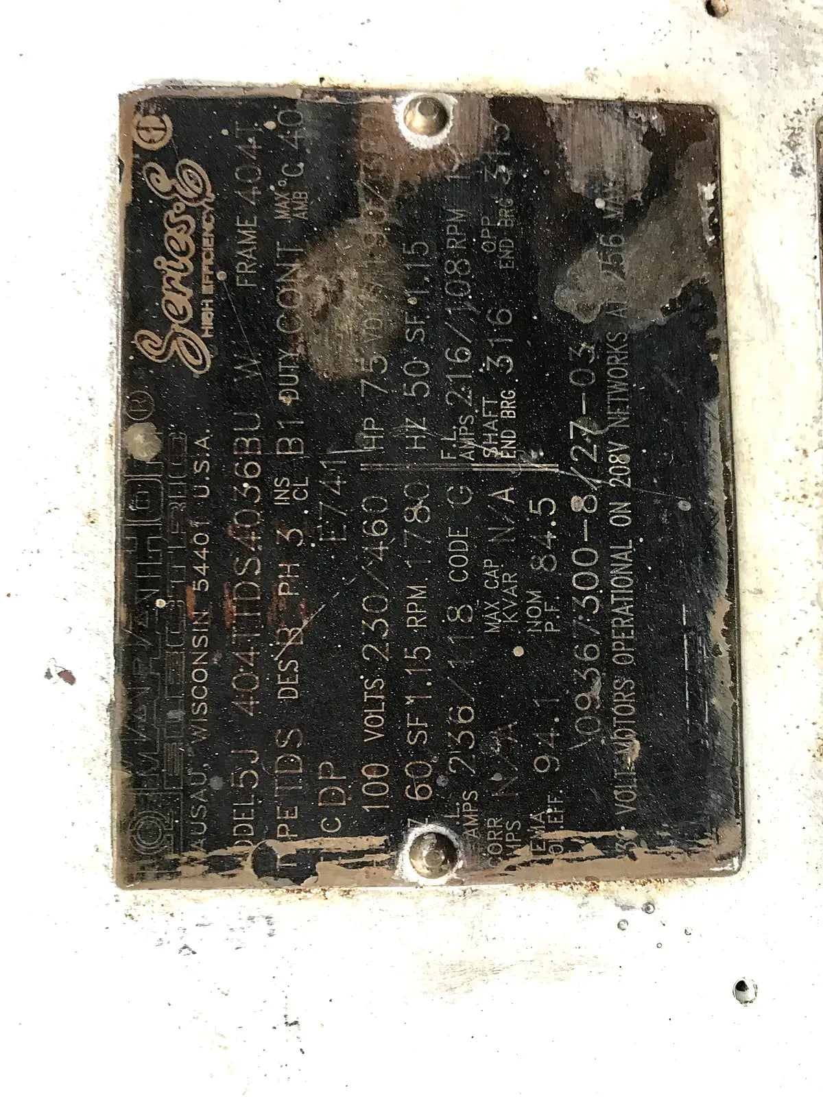 Used Vilter 440 Series 8-Cylinder Reciprocating Compressor. Model: 448. Serial: 16010ASRC. Marathon electric motor: 100 HP, 230/460V, 1780 RPM, 60 Hz, 3-phase, 404T Frame (also rated for 50 Hz, 75 HP, 190/380V. Overall dimensions: 6.5 ft. L x 4 ft. 2 in. W x 5 ft. H.