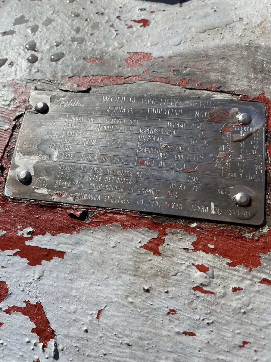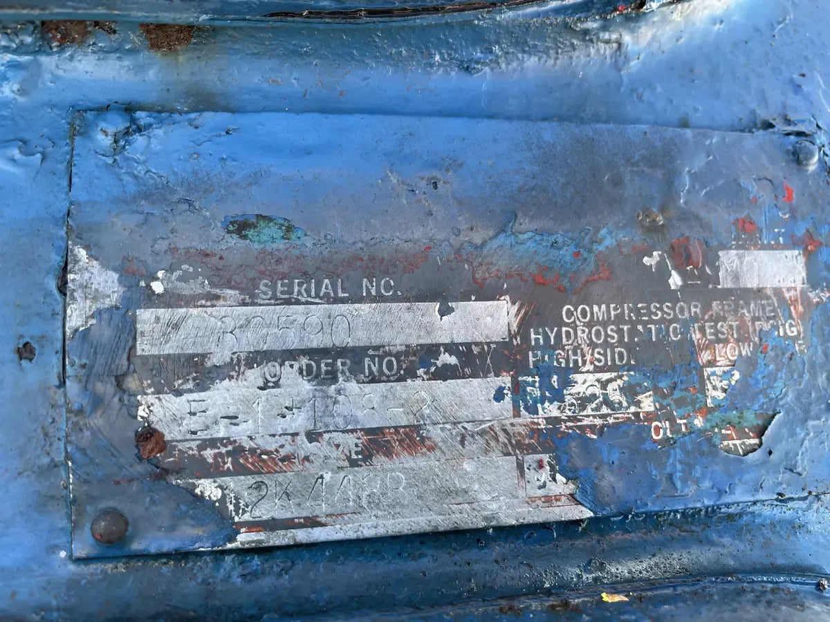 Vilter 448 8-Cylinder Reciprocating Compressor - Model: A12K448B, Serial No: 30590. Number Of Cylinders: 8, Maximum RPM: 1200. Bore & Stroke -In: 114x89, Displacement (CFM): 309, Suction Connection(in): 4, Discharge Connection(in): 3, Oil Charge - Gallon (Liter): 7(27), Maximum Discharge Temp: 300(149), Crankcase Of Temp Range: 43-54. Toshiba Electric Induction Motor - HP: 100, Model No: B1004VGF3U3, Frame: 404T, Type: TIKK, Form: VBK1, Volts: 230/460, Hz: 60, RPM: 1765, AMP: 244/122, Code: F, Time Rating: CONT, Serial No: 80318143, Bearings - Drive End: 6317, OPP.End: 6317.