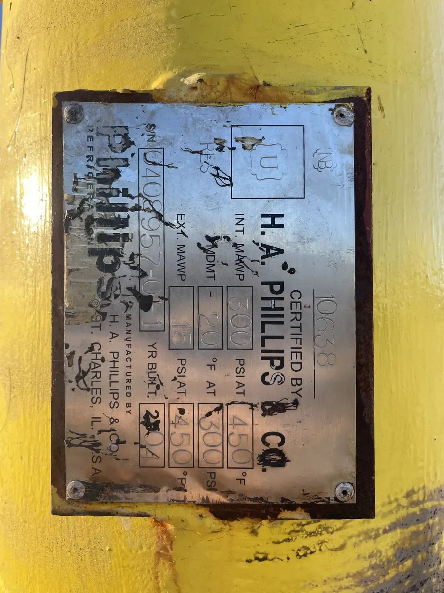 Vilter 448 8-Cylinder Belt Reciprocating Compressor - Model: A12K448, Serial: 30589, Order No: F-141081. Number of Cylinder: 8. Maximum RPM: 1200. Bore & Stroke(In-mm)- 114x89, Displacement(CFM): 309, Suction Connection(in): 4, Discharge Connection(in): 3, Unit Weight less Motor: 3400(1542), Oil Charge-(Gallon/Liter): 7(27), Maximum Discharge Temp C: 300(149), Crankcase of Temp Range C: 43-54. Previously Used With Ammonia. Toshiba Electric Induction Motor - HP: 100, Model No: B1004VGF3U3, Frame: 404T, Type: TIKK, Form: VBK1, Volts: 230/460, Hz: 60, RPM: 1765, AMP: 244/122, Code: F, Time Rating: CONT, Serial No: 80732250, Max.AMB: 40 C. Missing Belt Cover. Phillips Oil Separator - INT.MAWP: 300 PSI @ 450 F, MDMT: -20 F @ 300 PSI, EXT.MAWP: 15 PSI @ 450 F. Serial: 0408957-01-1, Year Built: 2004. Certified by H.A. Phillips & Co.