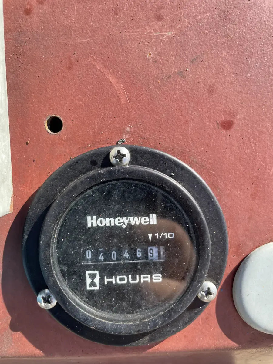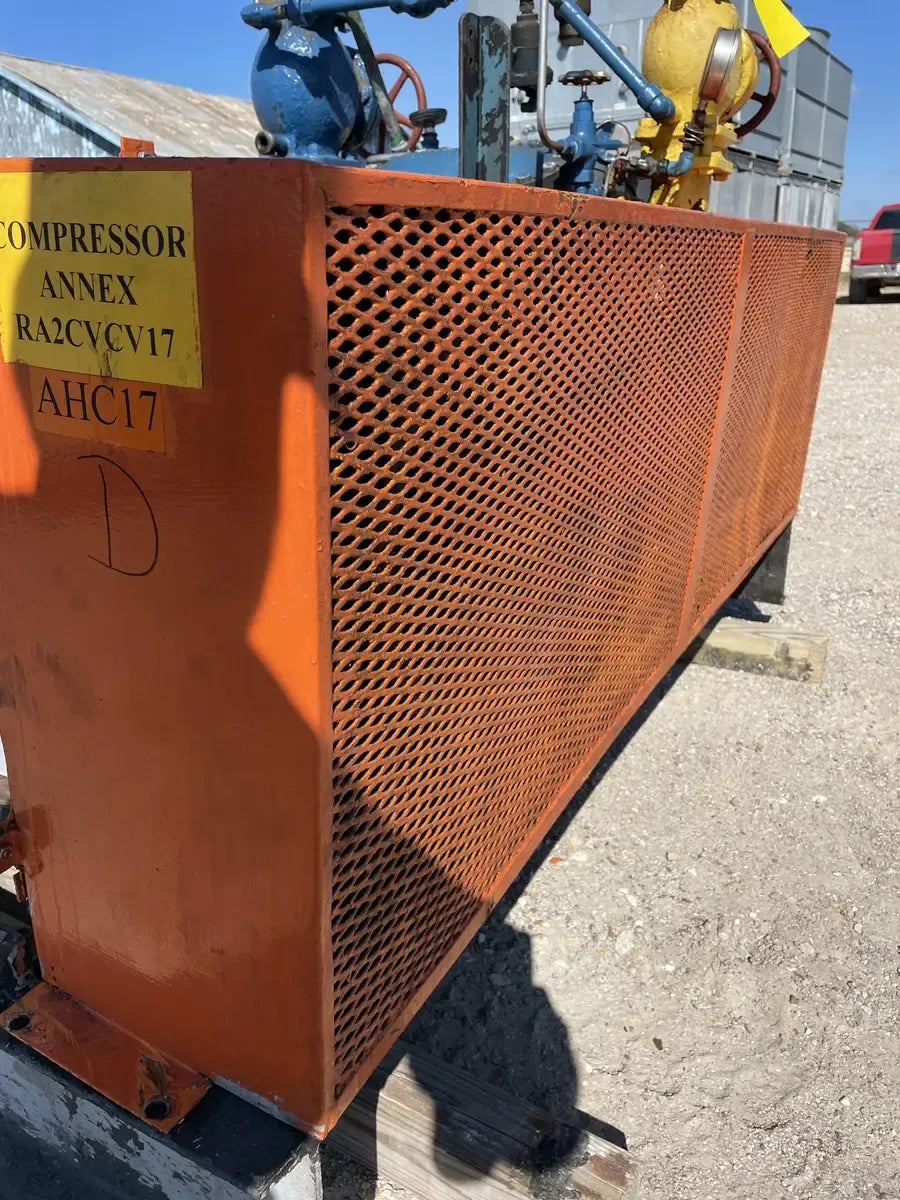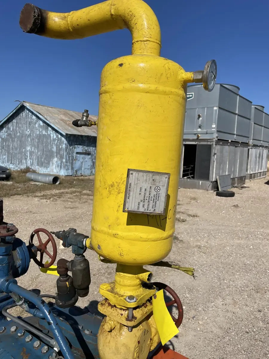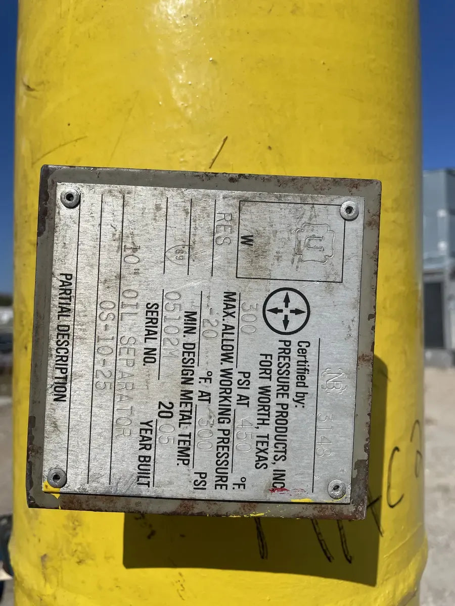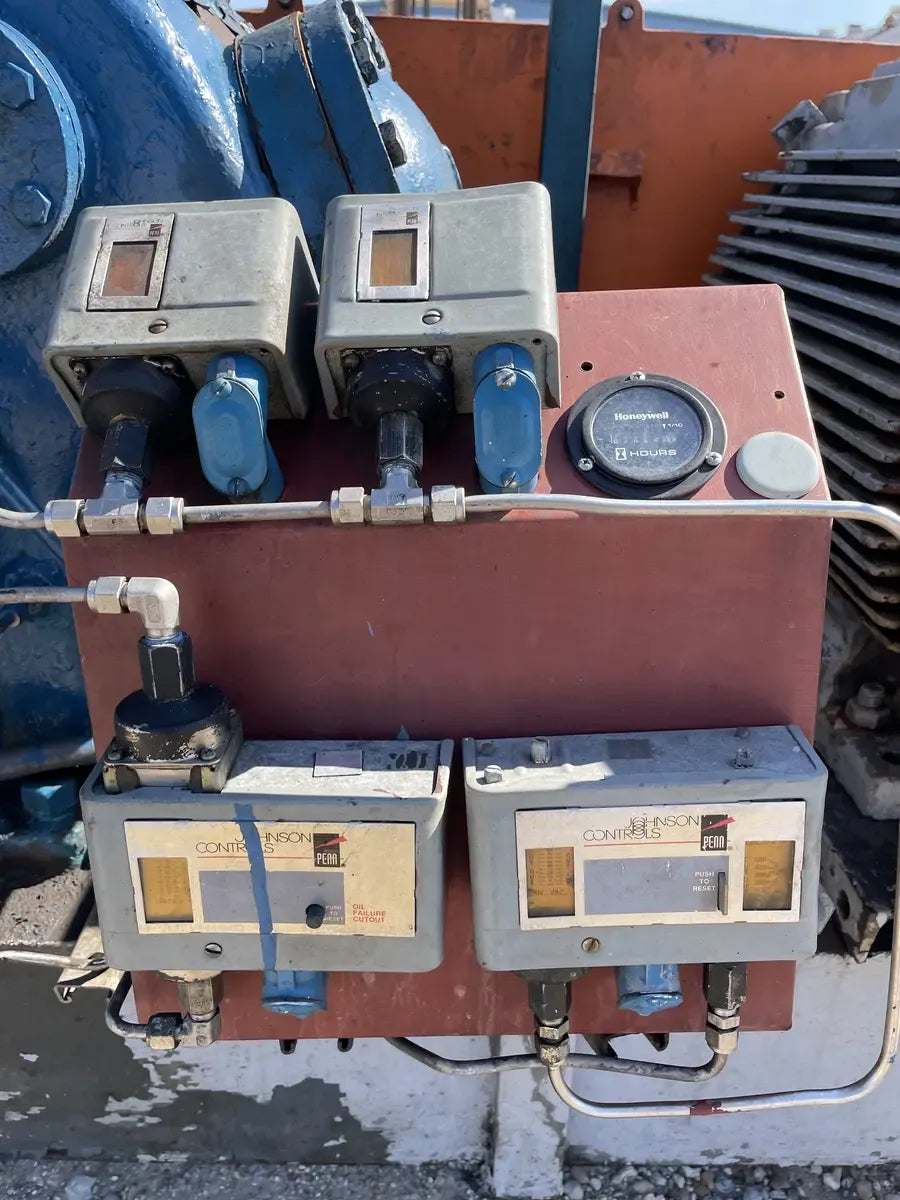 Vilter 448 8-Cylinder Reciprocating Compressor - Model: 448, Cylinders: 8, Serial No: B985941B, Displacement at Max RPM (CFM): 209. Compressor Connections (Line Size-Inches) - Suction(in): 4 ( 101.6 mm), Discharge(in): 3 (76.2 mm). Nominal capacity: 73.8 Tons of R-717 at 32.6 BHP with a 61.1°F condensing temperature and a 30°F suction temperature. Displacement: 155 CFM (at maximum rpm). Maximum RPM: 1200. Maximum discharge pressure: 300 PSIG. Maximum discharge temperature: 300°F. Maximum BHP with V-belt drive: 100 BHP. Maximum suction pressure: 150 PSI. GE Motors & Industrial Electric Motor - Serial No: 3N0223D31, HP: 100, RPM: 1190, Volts: 460, Frame: 444T, Hz: 60, AMPS: 113, Type: KS, Nema Nom EFF: 95.0, PH: 3, Power Factor: 87. Oil Separator - Certified by: Pressure Products, Inc, Max Allow Working Pressure 300 PSI @ 450F, Min Design Metal Temperature: -20 F @300 PSI, Serial No: 05102M, Year Built: 2005. National Board: 3148. Overall Dia(in): 10.