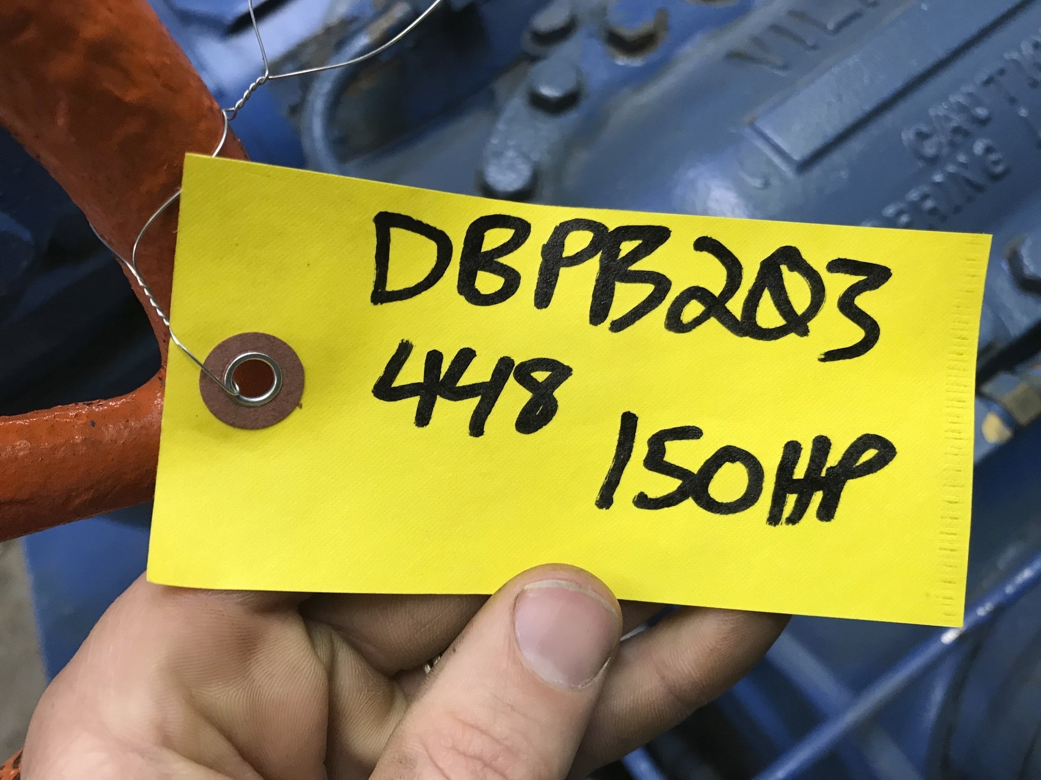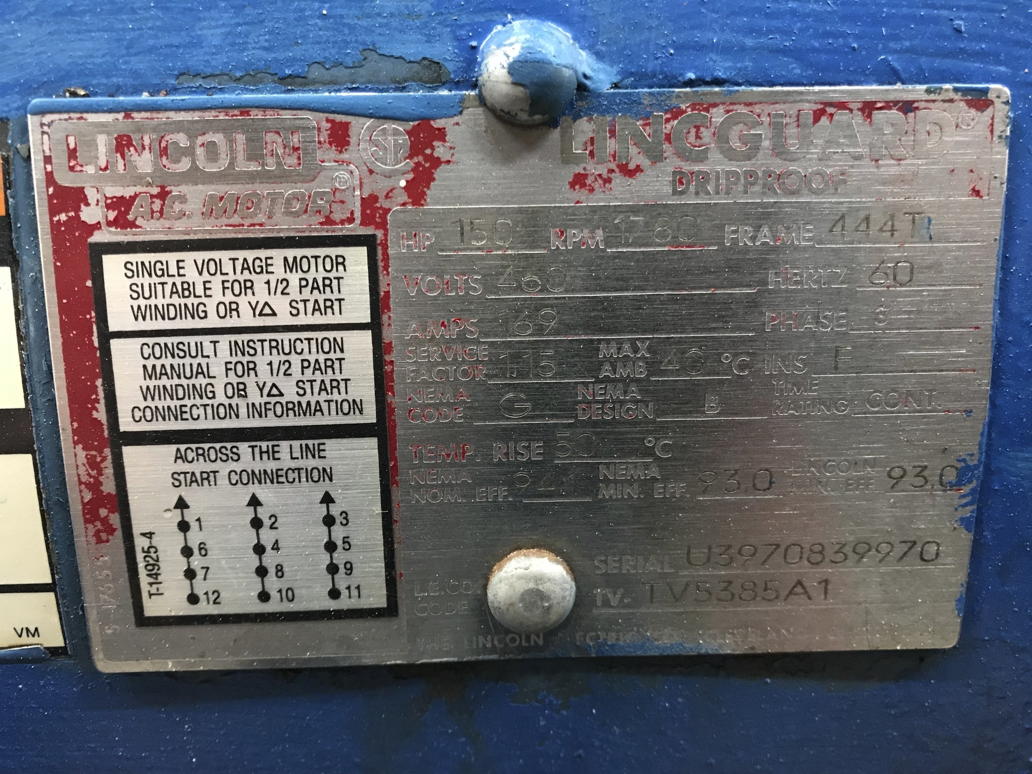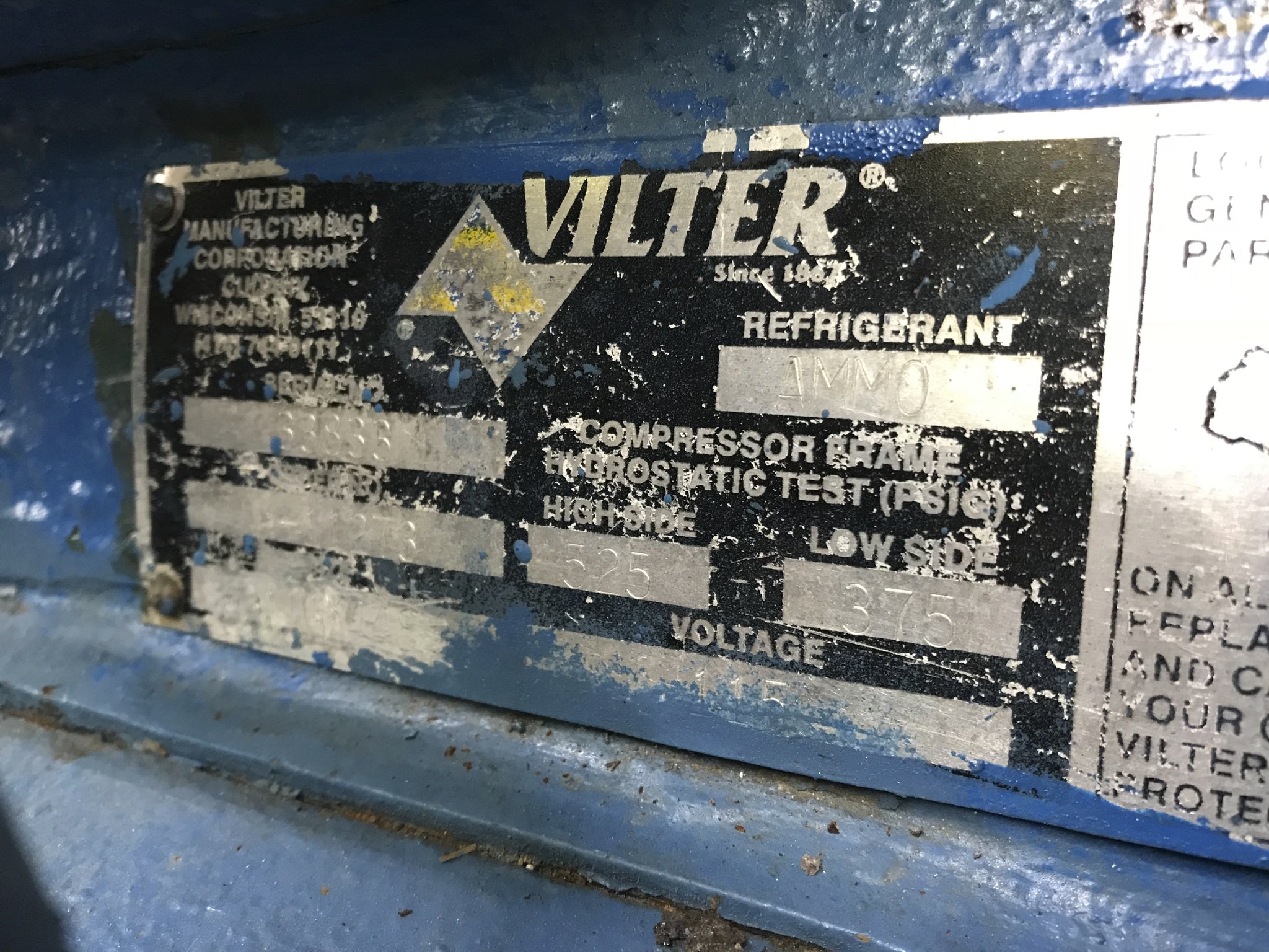 Used Vilter 440 Series 8-Cylinder Reciprocating Compressor. Model: 448. S/N: 33833. Order: K-11273. Size: A11K448. Refrigerant AMMO. Lincoln electric motor: 150 HP, 1780 RPM, 460V, 3-phase, 60 Hz, 444T Frame. Dimensions: 86 in. L x 48 in. W x 90 in. H. C-9