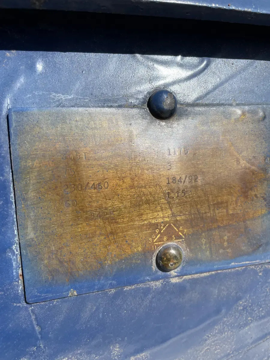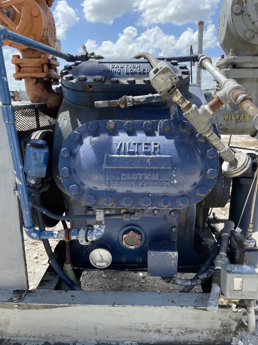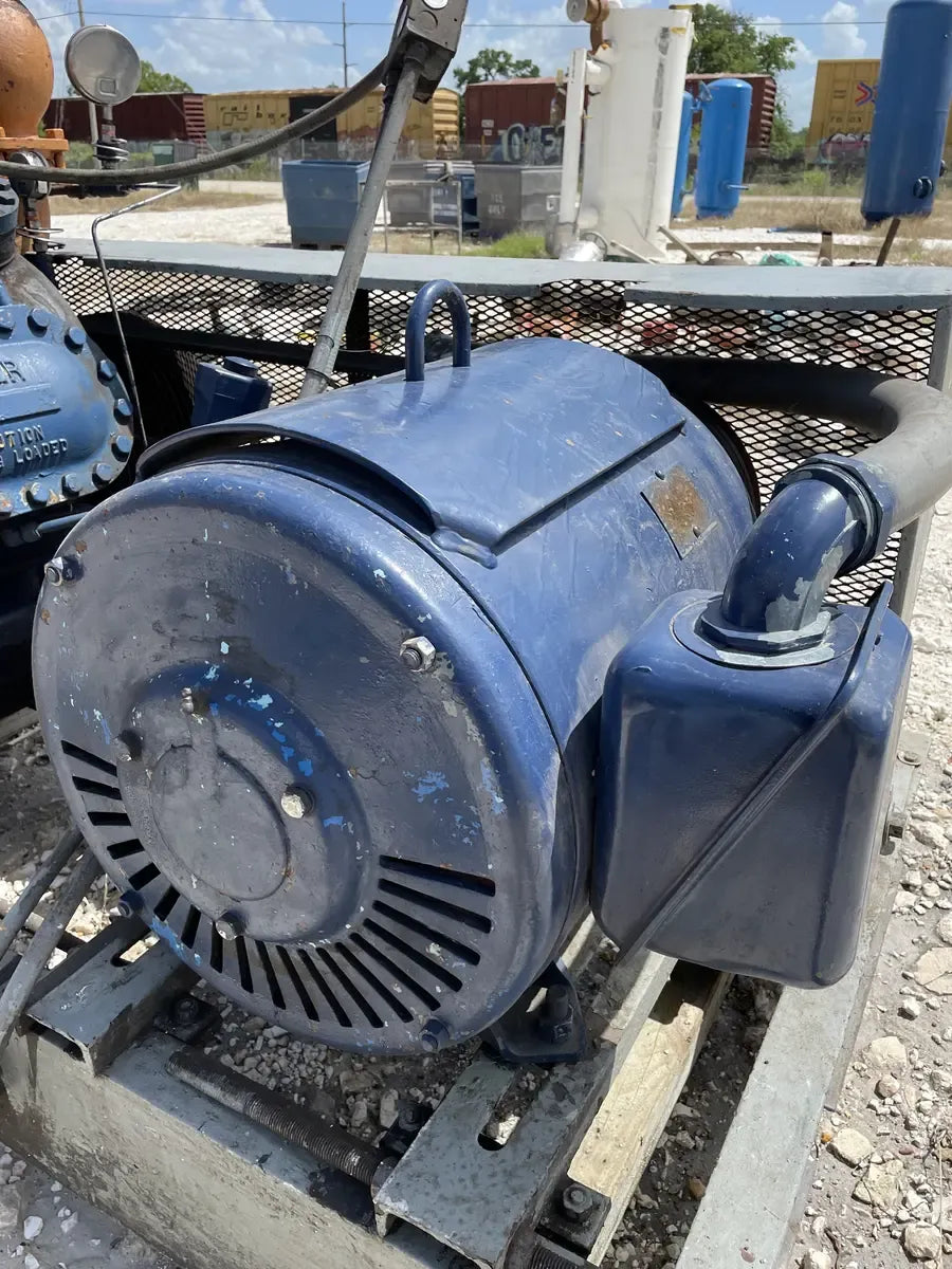 Vilter 448 8-Cylinder Reciprocating Compressor. The compressor is missing the data plate. The number of cylinders is 8. Voltage: 115V, Previous Refrigerant: Ammonia. Compressor Cylinder Quantity: 8. Displacement @ Max RPM(CFM): 209. Maximum RPM: 1200. Bore & Stroke(in): 114x89. Displacement (M3hr): 309. Total Weight less motor: 3400 LBS. Induction Motor: Frame: 405T, HP: 75, Hz: 60, Volts: 230/460, RPM: 1175, PH: 3. Motor plate is not visible.