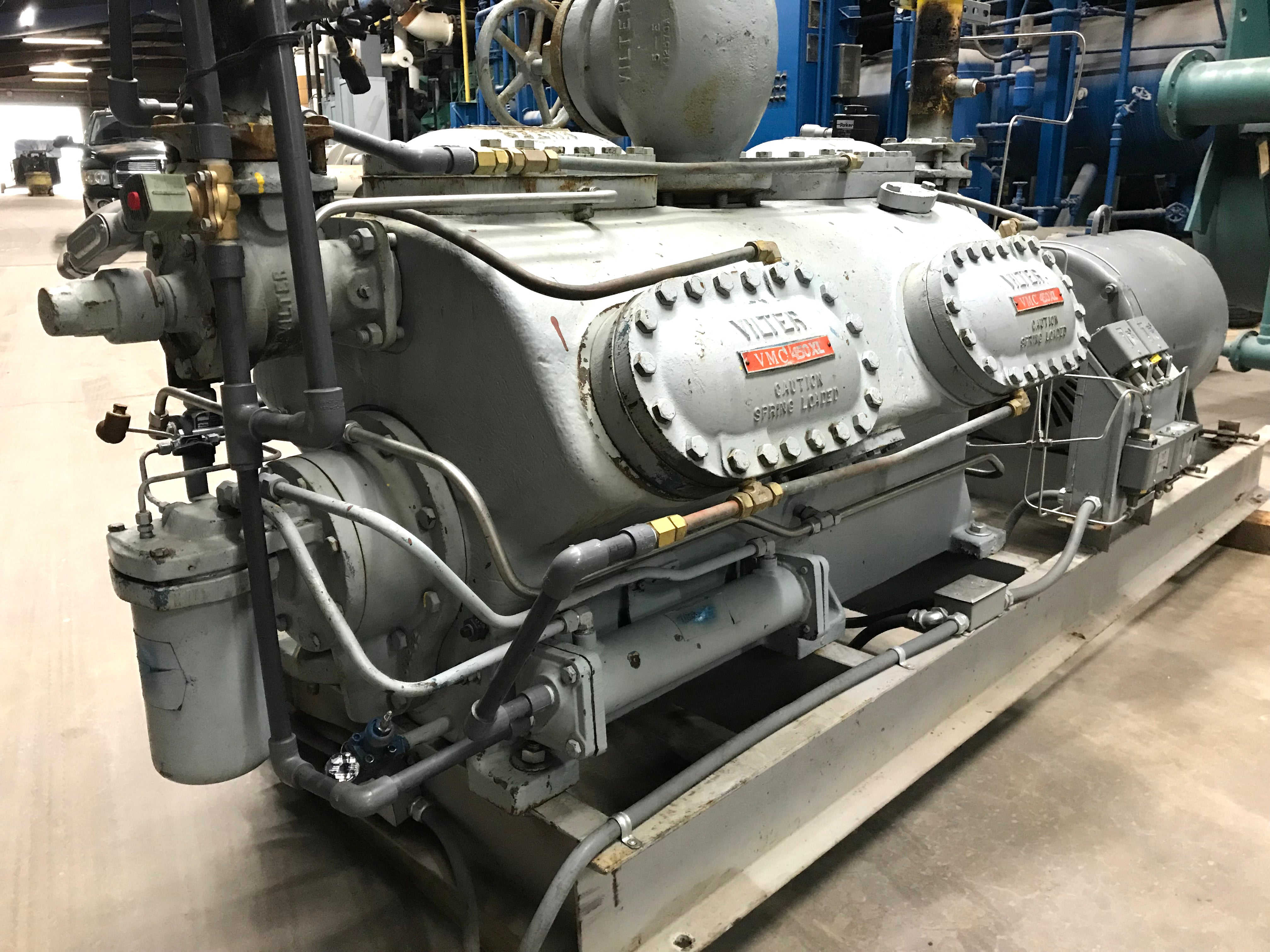Used Vilter Ammonia Reciprocating Compressor. VMC 450 XL Series. Size: M11K4512XLB. Serial: 63254. Number of cylinders: 12. Configured for ammonia refrigerant. Unit was refurbished (by a third party), installed, but has Zero Mfg. Co hours run time since rebuild. Lincoln Electric Industrial Duty Motor: 150 HP, 1185 RPM, 460V, 204 amps, 60 Hz, 3-phase, ODP enclosure, 445T Frame. Overall dimensions: 10 ft. 6 in. L x 41 in. W x 6 ft 3 in. H.