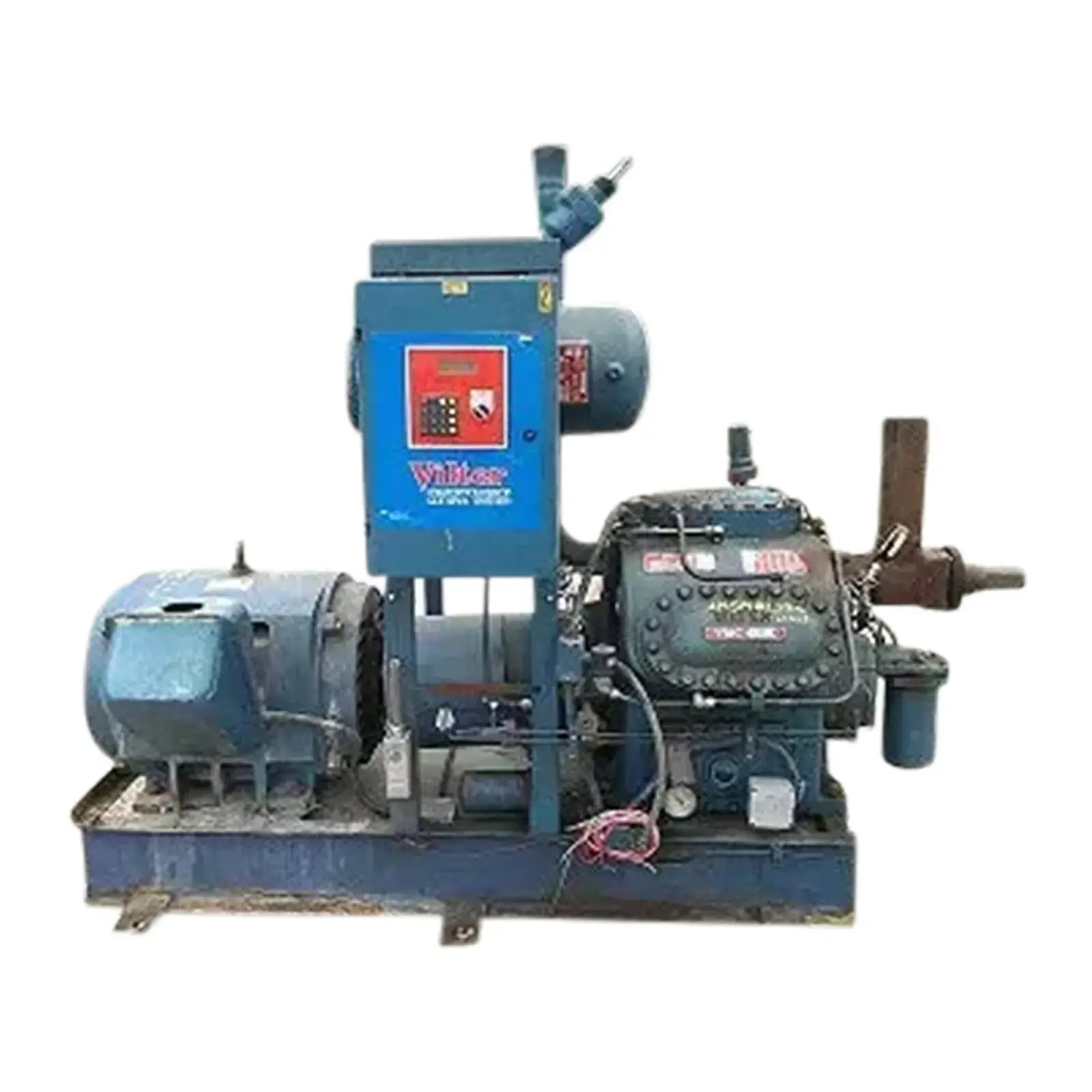 Used Vilter / Emerson Climate Compressor Package. Model 450-XL. Serial: 63990. Order No.: F91099-1. Size: M11K456XLD. Number of cylinders: 6. Year: 1993. Motor size: 100 HP. Refrigerant: R-22. Compressor hydrostatic Test (PSIG): 525 High Side / 375 Low Side. Oil Separator certified by Vilter: serial 3-44910-3, 350 PSIG at 400F MAWP,-20F at 350PSIG MDMT, 1992, 38662 Nat’l Bd. Toshiba Motor: 100 HP, 230/460V, 60 Hz, 3-phase, 1190 RPM, 444T Frame. Last run with a chiller in an ice rink application. Includes compressor, motor, base, oil separator vessel, and Vilter Microprocessor Control System. Overall Dimensions: 45 in. W x 95 in. L x 75 in. H. (H)