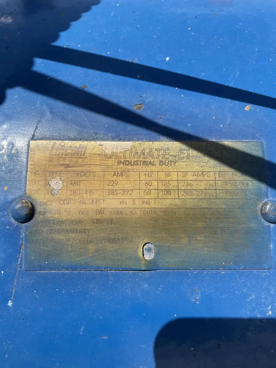 Vilter 4512XL 12-Cylinder Reciprocating Compressor. Model: A12K4512XL, Serial No: 66306, Sales Order: K20592. Previous Refrigerant: Ammonia. Compressor Frame Hydrostatic Test (PSIG): High Side: 525, Low Side: 375. Voltage: 115 V. Maximum RPM: 1200. CFM @ Maximum RPM: 597m/hr. Lincoln 3 Phase Industrial Duty Motor: HP: 200, Volts: 460, AMPS: 229, Hz: 60, SF: 1.25, SF AMPS: 286, PH:3, FR: 445T.