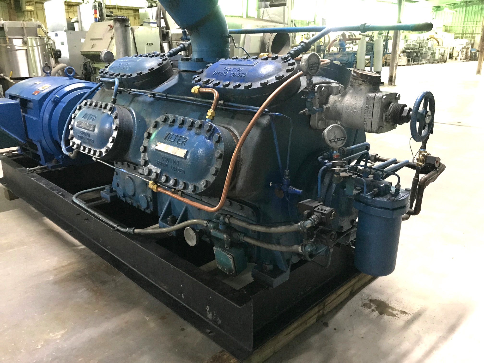 Used Vilter 4516 Reciprocating Compressor - 300 HP. Compressor nameplate is missing. Number of cylinders: 16. Marathon electric motor: 300 HP, 1185 RPM, 460V, 60 Hz, 3-phase, DP enclosure, 449T Frame. Previously run on ammonia refrigerant, removed running.