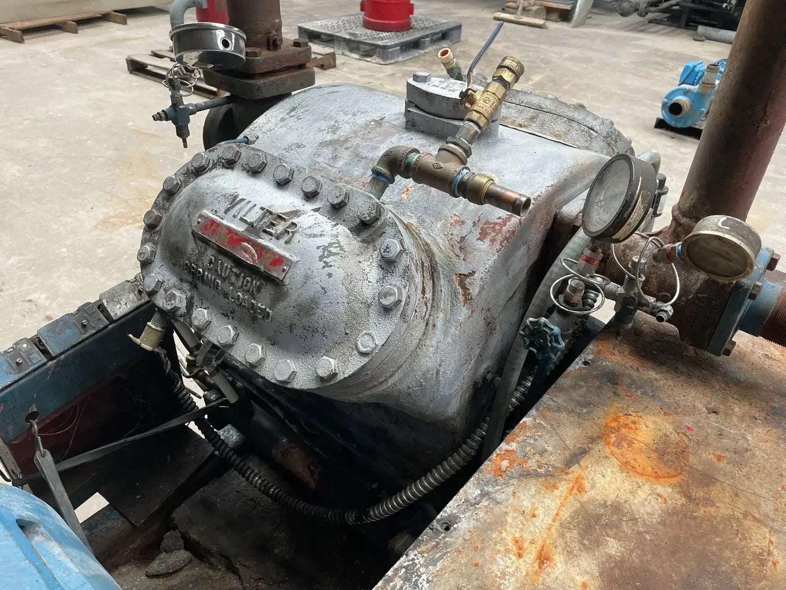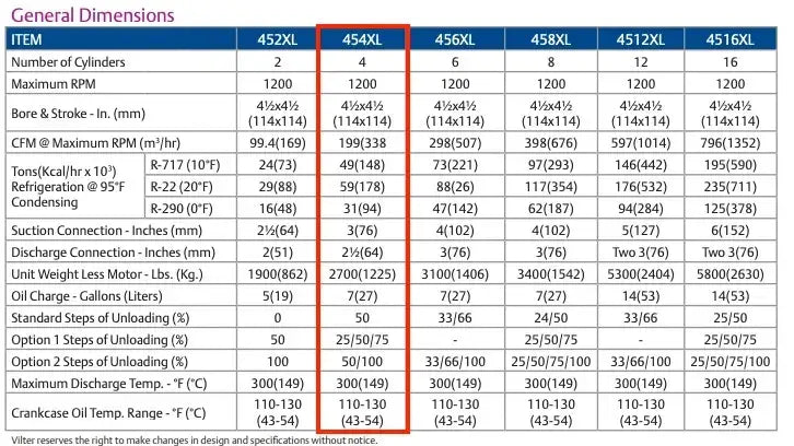 Vilter Reciprocating Belt Driven Compressor Package. Model: 454XL. Serial No: 591746-2. Number of Cylinders: 4. Maximum RPM: 1200. Suction Connection: 3in. Discharge Connection: 2.5in. Maximum Discharge Temperature: 300 F. CFM @ Maximum RPM: 199. Toshiba 3 Phase Induction Motor: HP: 50, Volts: 230/460, RPM: 1780, Amps: 120/60, Hz: 60.