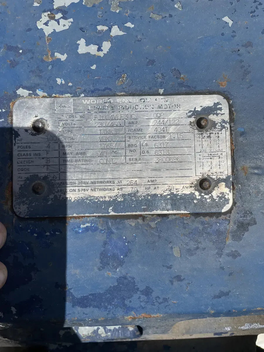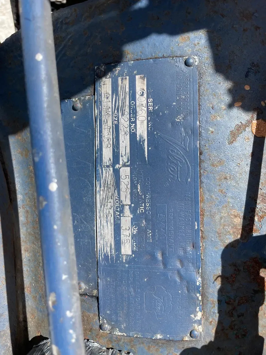 Vilter 456 6-Cylinder Reciprocating Compressor. Model: A11K-456B, Serial No: 60760, Sales Order No: F-58228. Voltage: 115V. Compressor Frame Hydrostatic Test (PSIG): High Side: 525, Low Side: 375. Previous Refrigerant: Ammonia. Toshiba Induction Motor: HP: 100, Poles: 4, Class Ins: F, Model No: B1004VLF3UC, Volts: 230/460, Type: TIKK, Form: VBK1, RPM: 1765, Max AMB: 40 C, Time Rating: CONT, AMPS: 244/122, Frame: 404T, Service Factor: 1.15, Serial No: 3800696.
