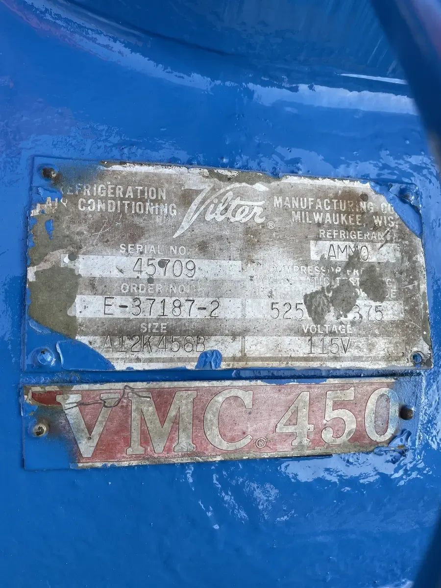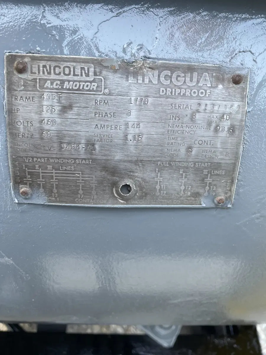 Vilter 456 6-Cylinder Reciprocating Compressor. Serial No: 45709, Order No: E-37187-2, Size: A12K456B, Voltage: 115V. High Stage Reciprocating Compressor. Maximum RPM 1200. The unit has been The Compressor has been freshly painted. Has the Oil Separator and Control Panel. The number of Cylinders is 6. Lincoln Motor - Frame: 405T, RPM: 1770, Serial No: 2497252, HP:125, PH: 3, Ins: B, Volts: 460, AMP: 144, Time Rating:Cont, Hertz: 60, Service Factor: 1.15.